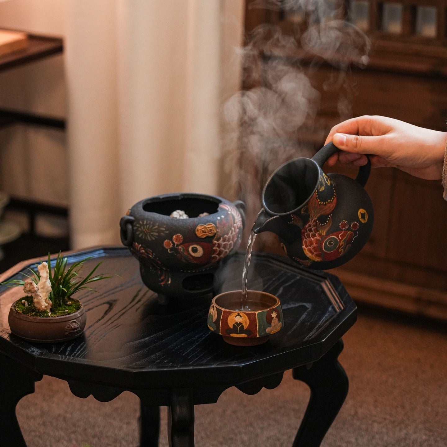 The earthy brown and golden tones complement each other perfectly, creating a warm and timeless look. Despite its small size, it has a solid, meaningful presence. Overall, this teapot is not just a vessel—it’s a little work of art. It brings personality, warmth, and a touch of storytelling to any tea ritual. It’s only 80 ml, perfect for enjoying special teas that you want to appreciate little bit extra.