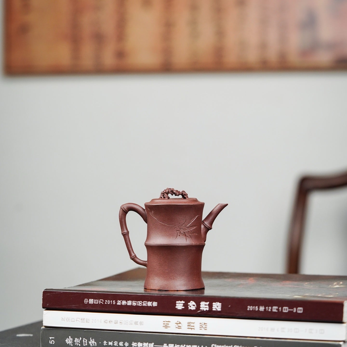 以竹入壺,竹節向上而生,直勁高挺,流把蓋鈕亦取竹段,生動自然