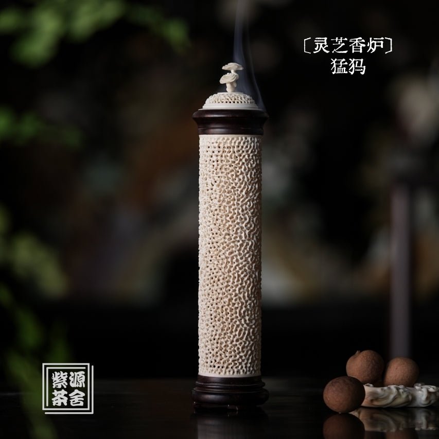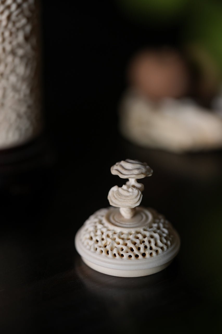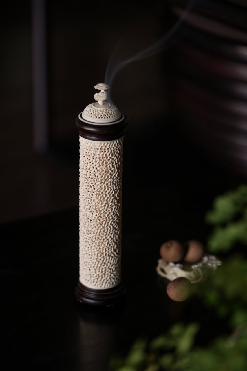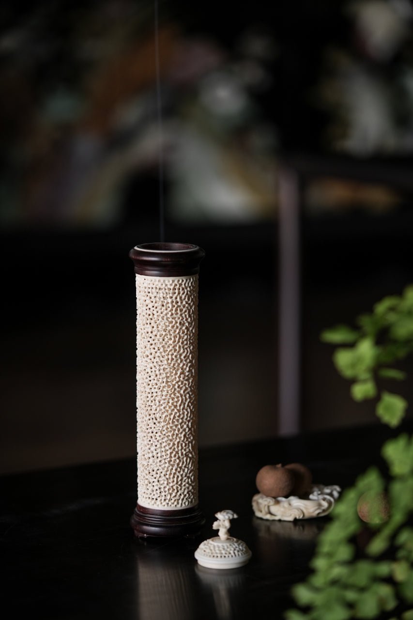 牙質凝脂生暈,爐身透雕雲紋流轉。靈芝為鈕,層疊如祥雲初綻。燃香時青煙穿鏤過隙,恍若瓊樓玉霧,一案之間,盡得清韻。
