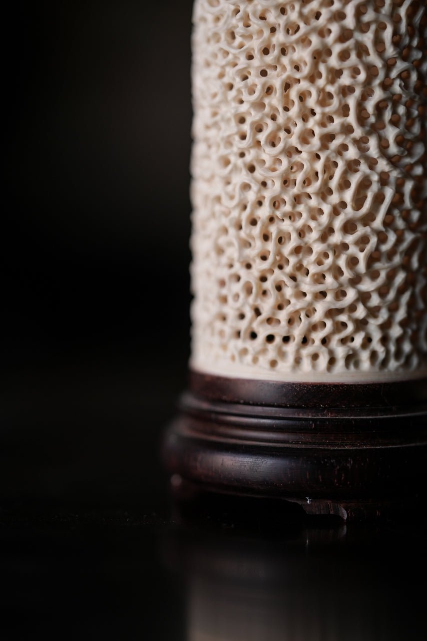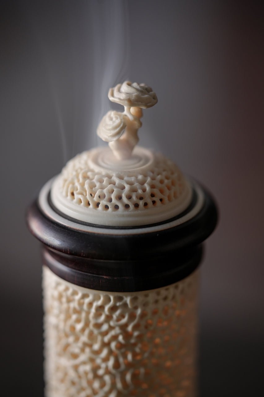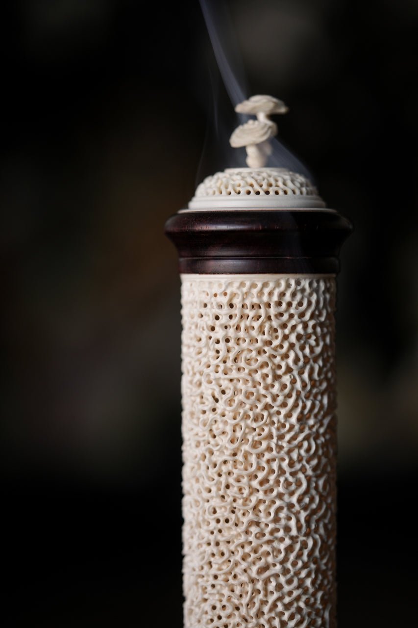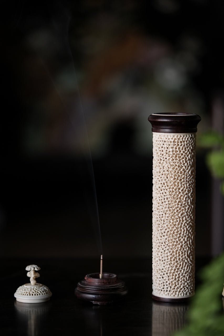 牙質凝脂生暈,爐身透雕雲紋流轉。靈芝為鈕,層疊如祥雲初綻。燃香時青煙穿鏤過隙,恍若瓊樓玉霧,一案之間,盡得清韻。
