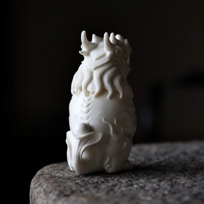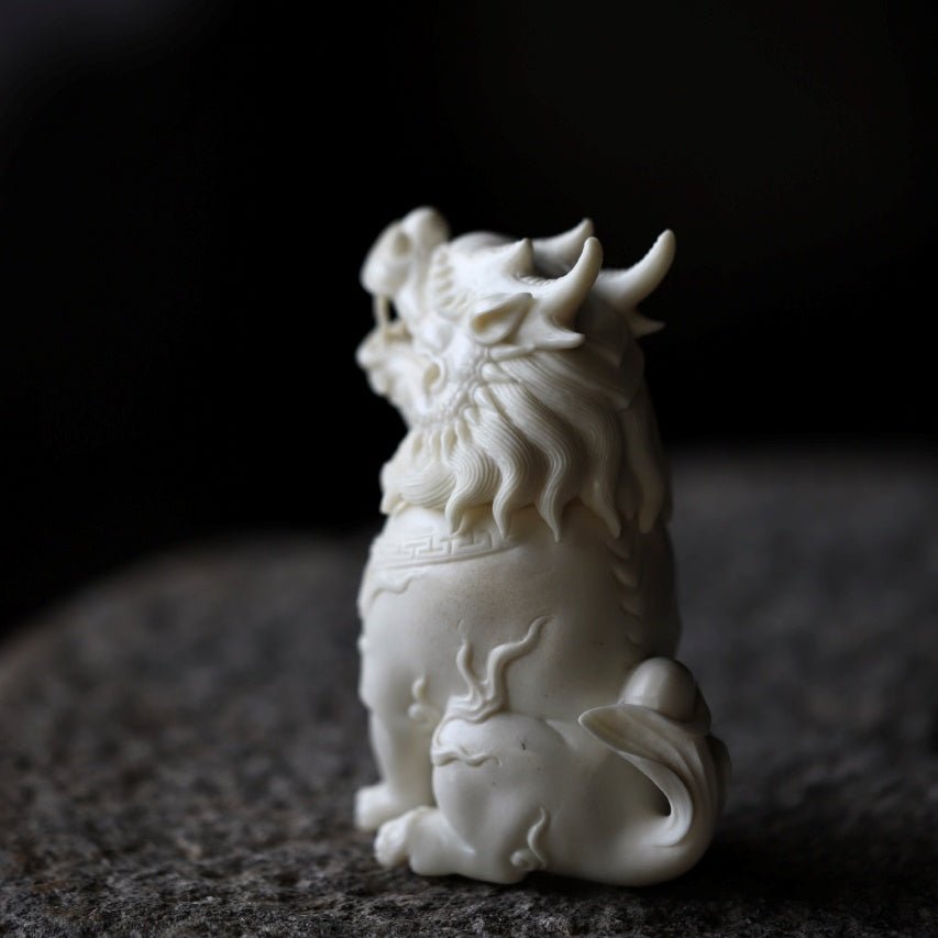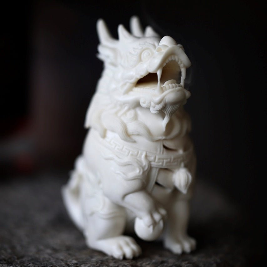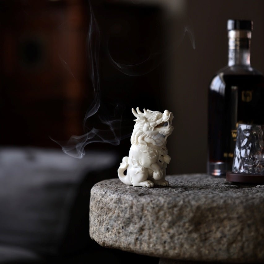 鹿角質堅,紋理天成,蘊自然之古樸。精琢貔貅為爐,貔貅昂首瞠目,獠牙畢現,身披麟甲,神韻盡展,招財瑞意滿盈。爐體線條簡逸流暢,焚香之際,香煙渺渺,增一室文雅祥和。