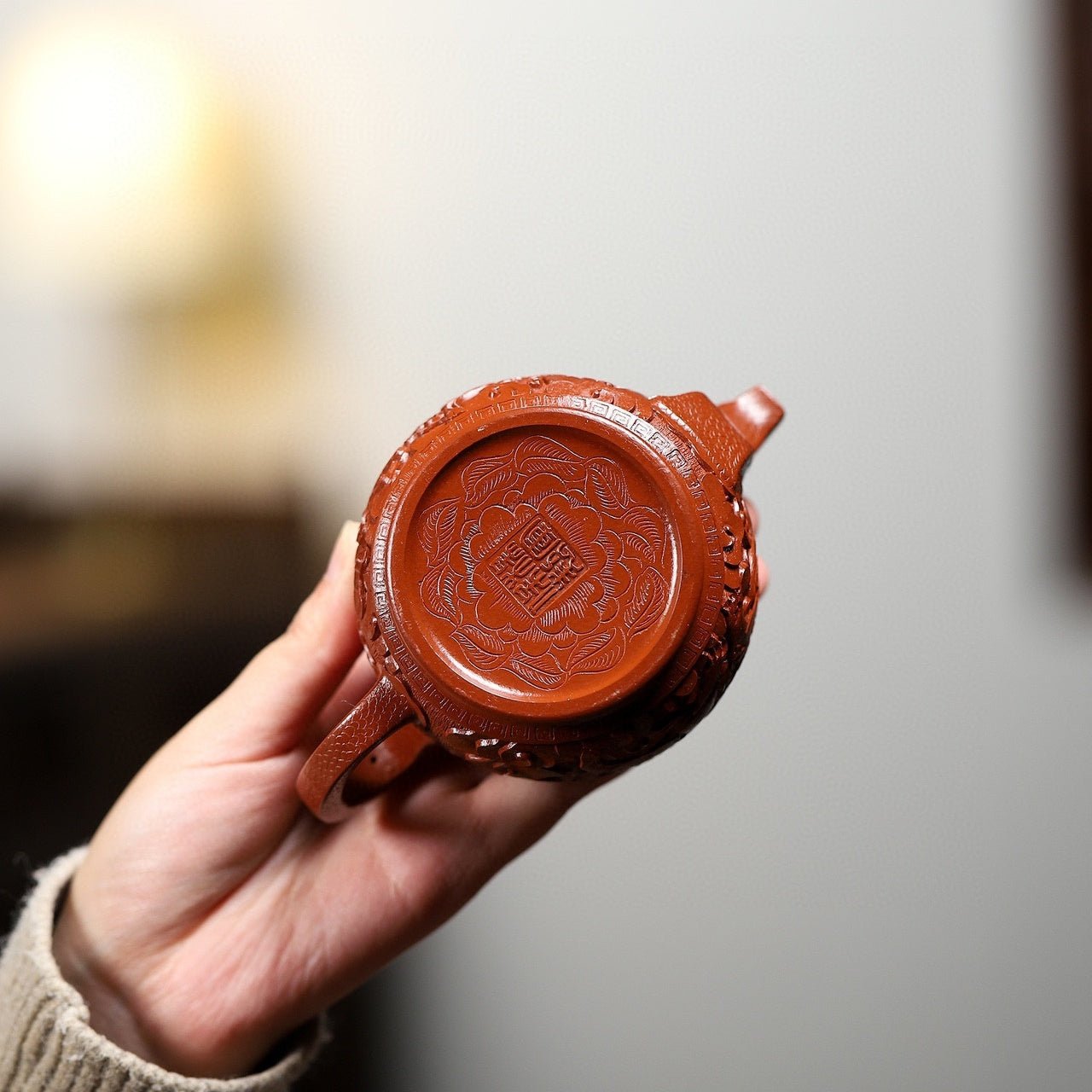 This Hehuan teapot is beautifully shaped, its rounded form reflecting the masterful craftsmanship of the craftsman. The spout, handle, and knob are all square in shape. The engraving on the teapot features traditional Chinese mythical beasts, blending the artistic conception of traditional Chinese painting with the perspective composition of Western painting, using bas-relief to create a sense of relief and texture.
