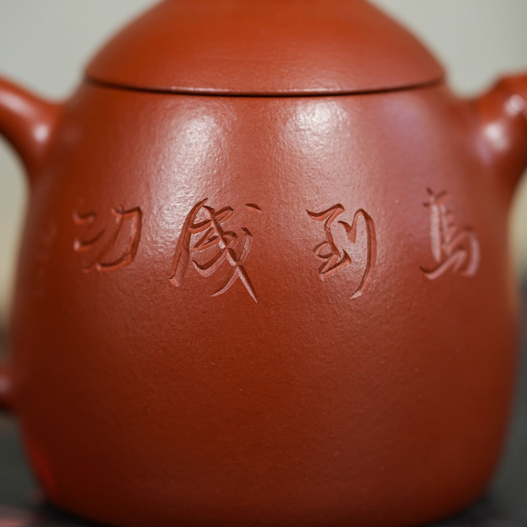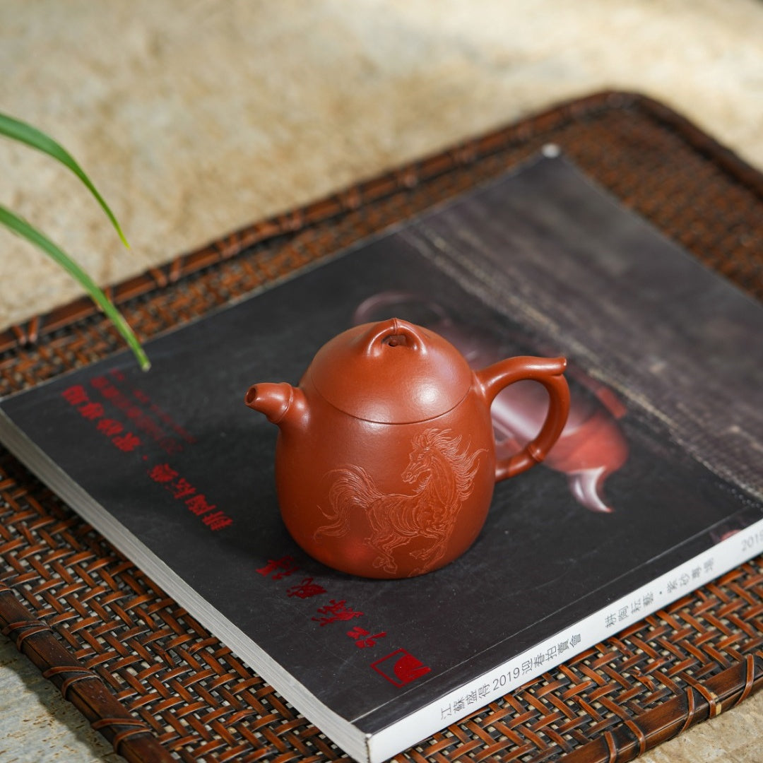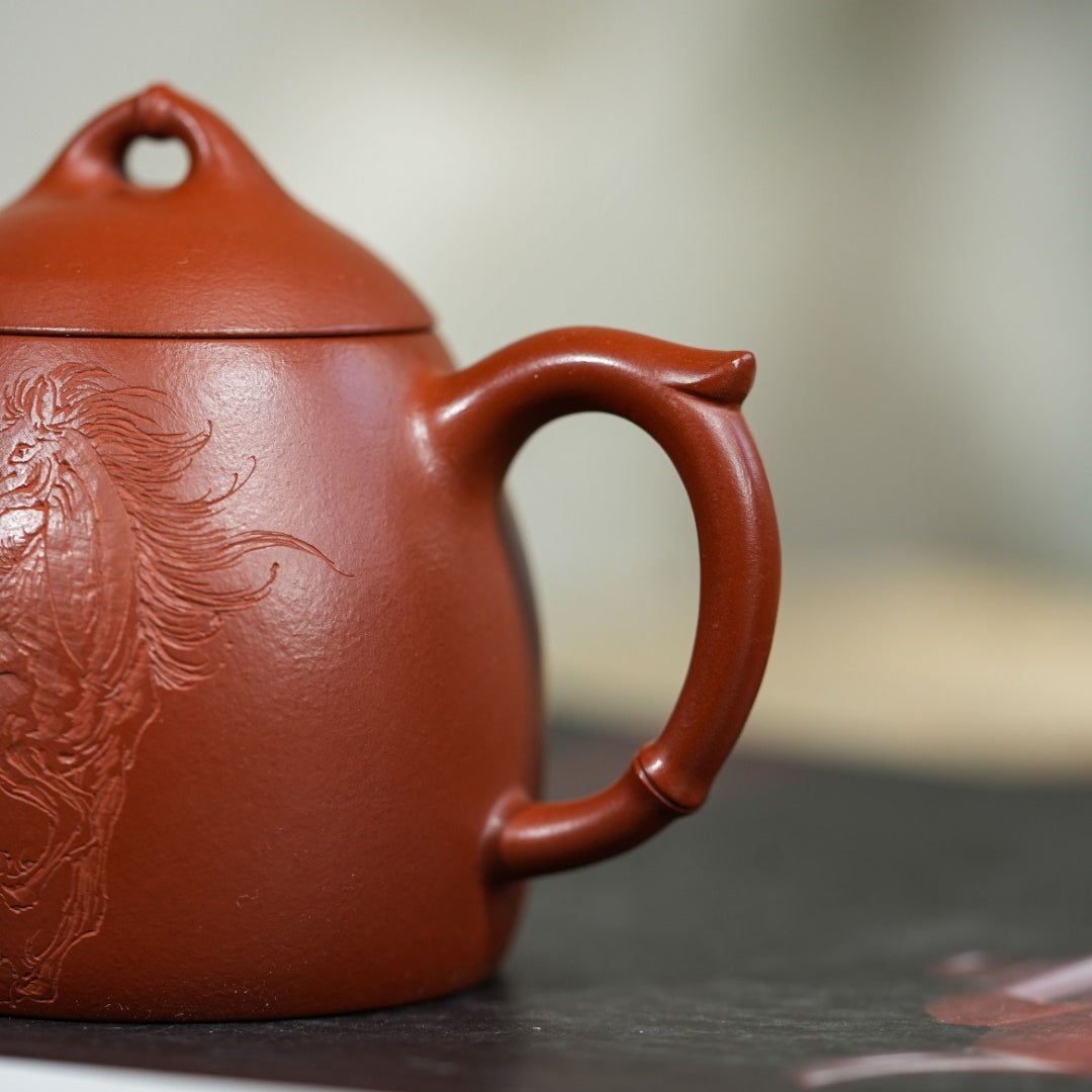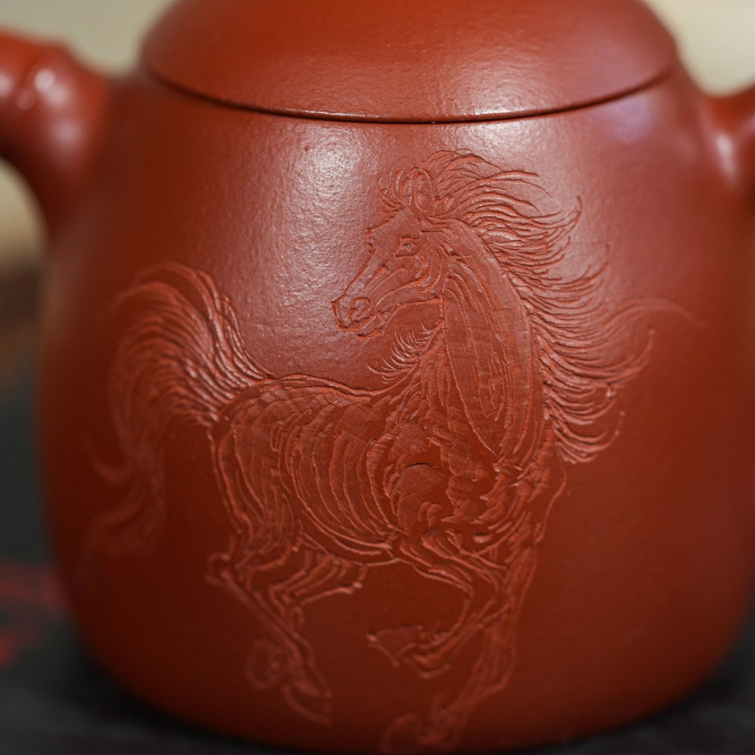 壺身刀筆刻奔馬,鬃毛飛動如挾風,旁題 “馬到成功”,筆意蒼勁 —— 既是茶事裡的吉意,也是手工刻繪的匠心底氣。
