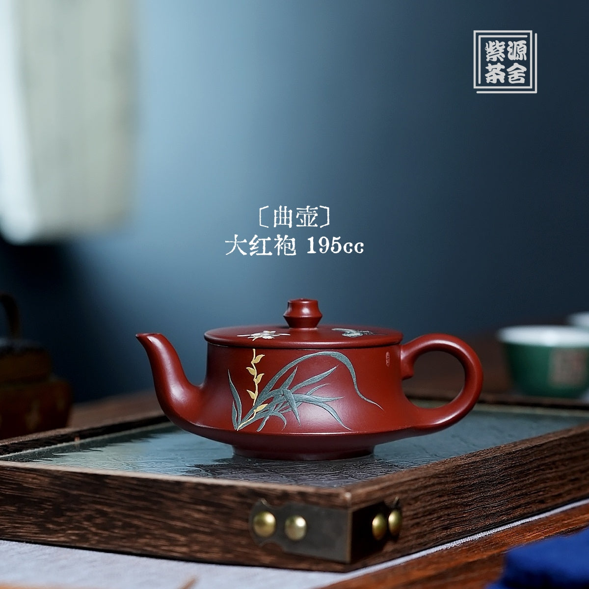 曲壺是款一直被稱讚的器型,其器型來自蝸牛,大紅袍色調溫潤、質樸典雅,充分展現出曲壺輪廓線條韻律 美的特點。微翹的壺嘴增強了蝸牛抬頭爬行的動態。壺體精巧大方,線和麵的轉折處理的乾淨俐落,用以品茗會有另一種韻味。