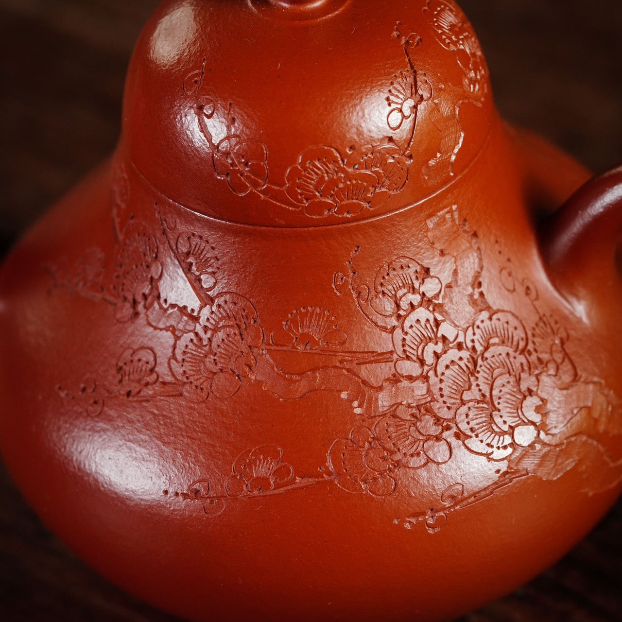 The body of the pot is carved with plum blossoms, just as the spring breeze is chasing after it.