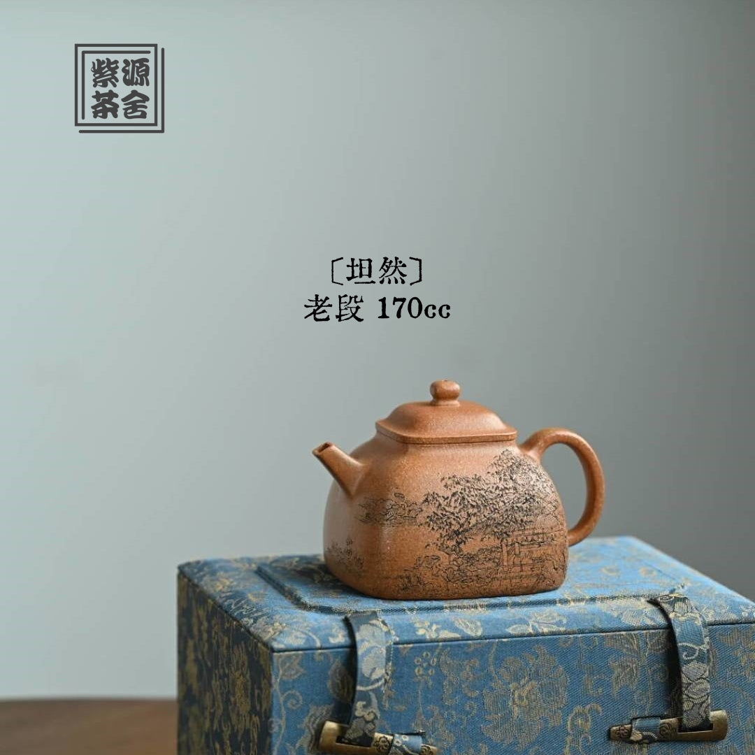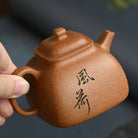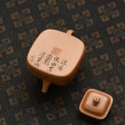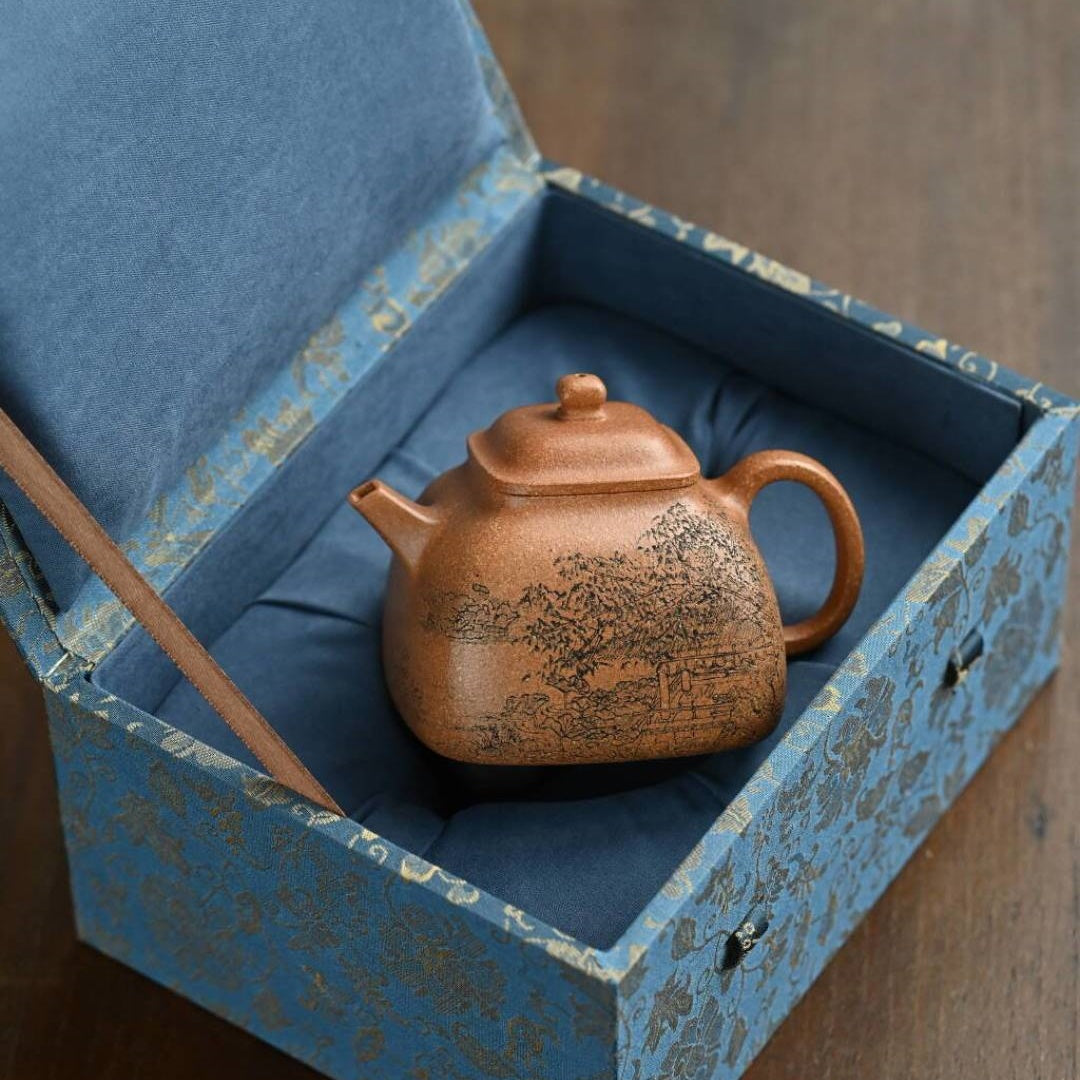 傳統器型,四方壺身,線條挺括有力,上斂下豐如塔舒展,色澤素雅。壺身刻風荷與密林涼亭,寓意高潔清雅、悠然自得;精巧絕倫,實用與美觀俱佳。