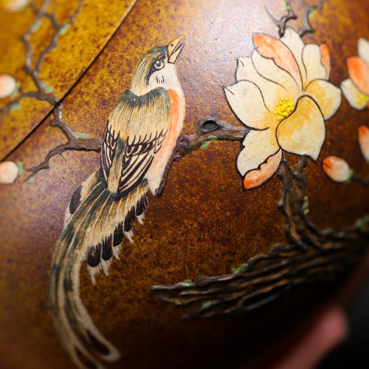 The shape of the pot is elegant, stretched and upright, dignified and steady, soft and firm; the spout is crisp and powerful, and the water is full of momentum.Coupled with extraordinary decoration, it is even more icing on the cake