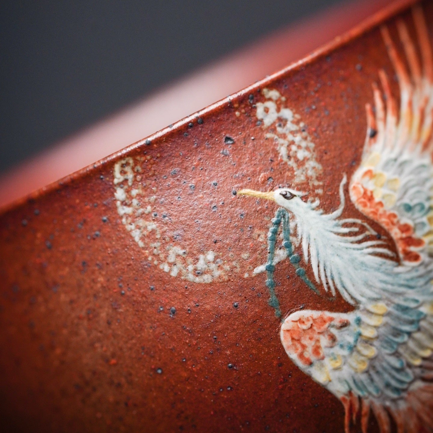 手工泥繪鳳凰,色彩豐富多彩,壺身線面屈曲和諧,化具象於寫意,將鳳凰的幽雅演繹活靈活現。