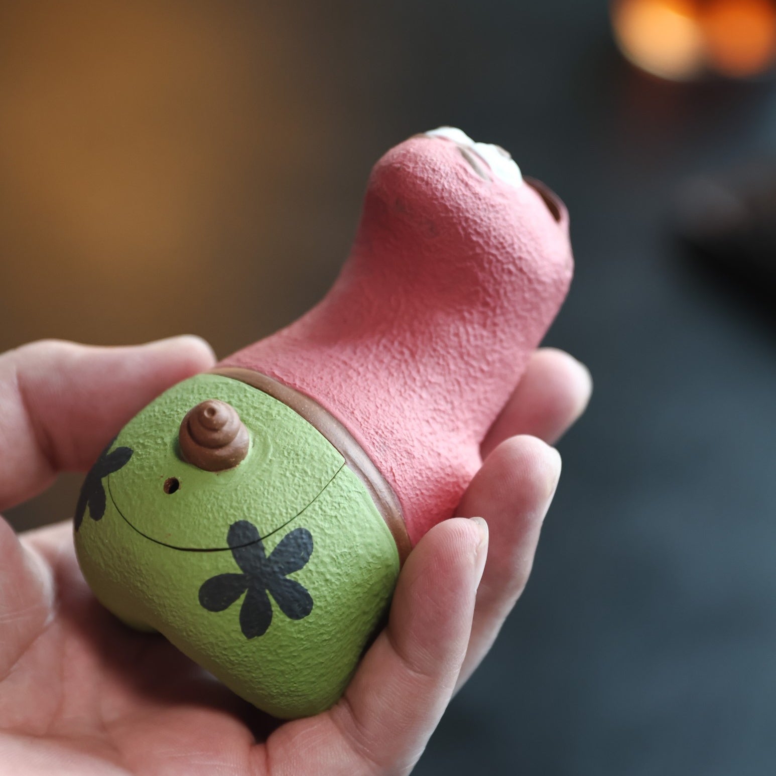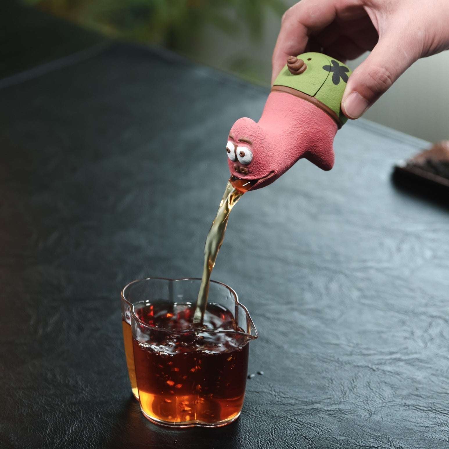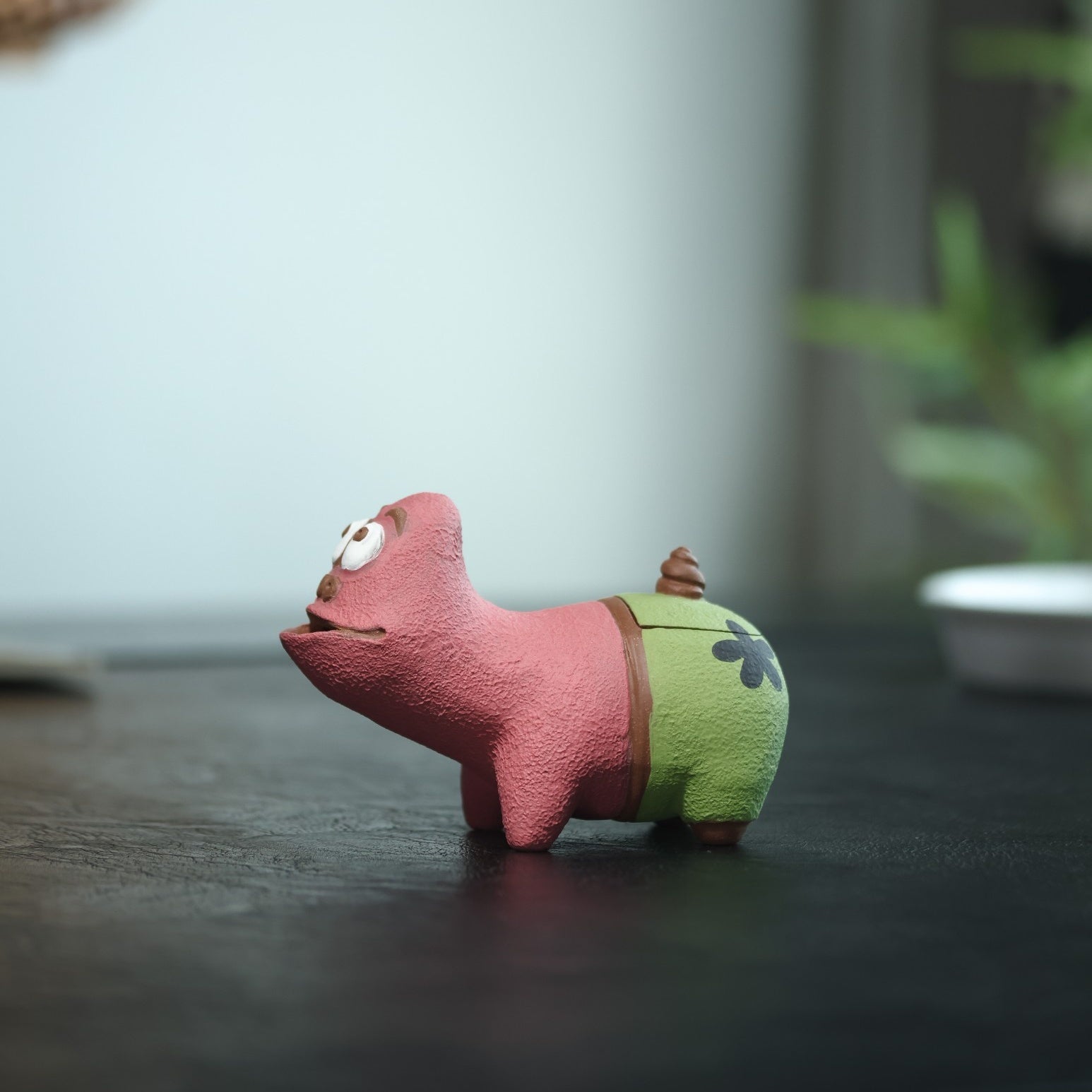 This teapot's design is inspired by Patrick, the central character from the animated series "SpongeBob SquarePants." Its symbolism embodies an optimistic and positive attitude toward life, unconditional friendship, a free spirit against involution, and a sense of security in relationships. These connotations are derived from the character's traits and the evolution of cultural communication. Used on purple clay, it's perfect for viewing, playing, and brewing tea. Collectibles are welcome.