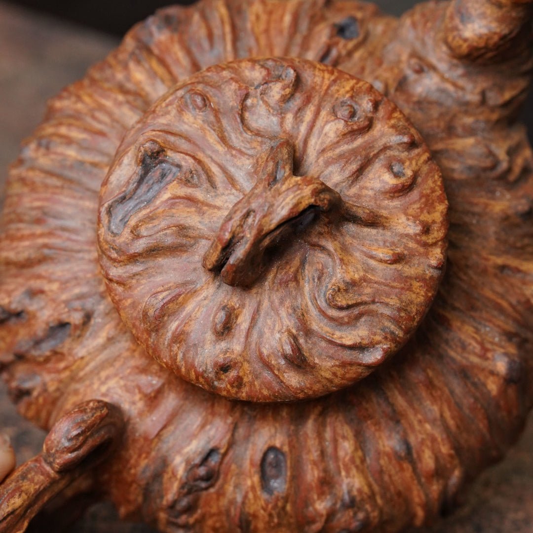 【樹癭壺】系列採用最原始捏塑法,手工絞泥而成,利用紫砂天然特性,大顆粒調砂,晾泥乾裂形成天然木質肌理,宛然天成,盡顯樹幹的百年滄桑,樹節傷殘,年輪留痕,樹癟點點,展現木檀木的自然美感。