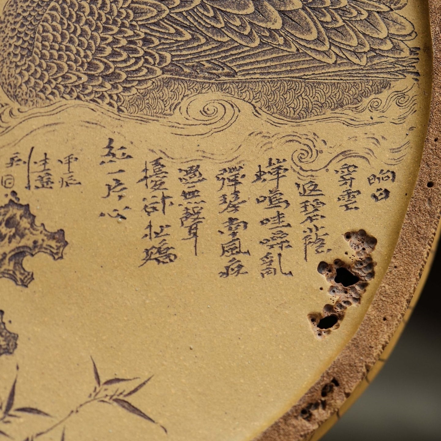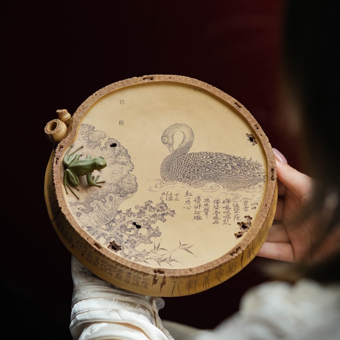 【Bamboo brings peace】 【Production】Chen Zhen 【Customer】Shi Shengyi 【Size】20cm diameter, 4cm height "May you be like a frog and know the fun of tea May your heart be like a swan and travel the world A lotus leaf carries all things Drink, watch and be happy"