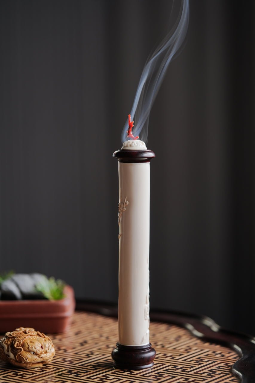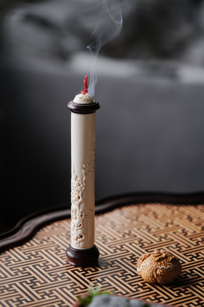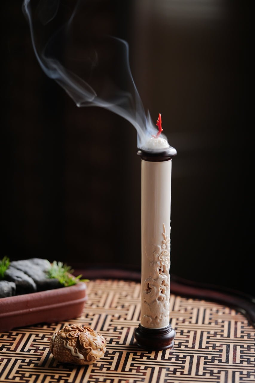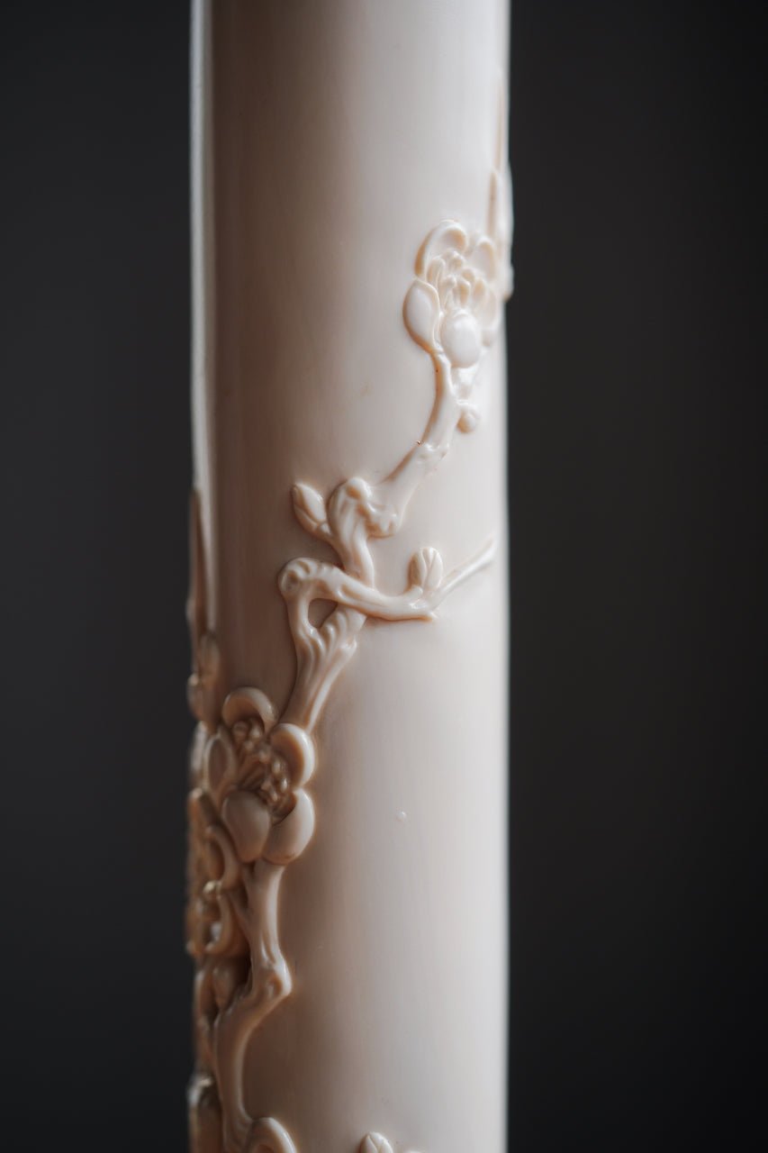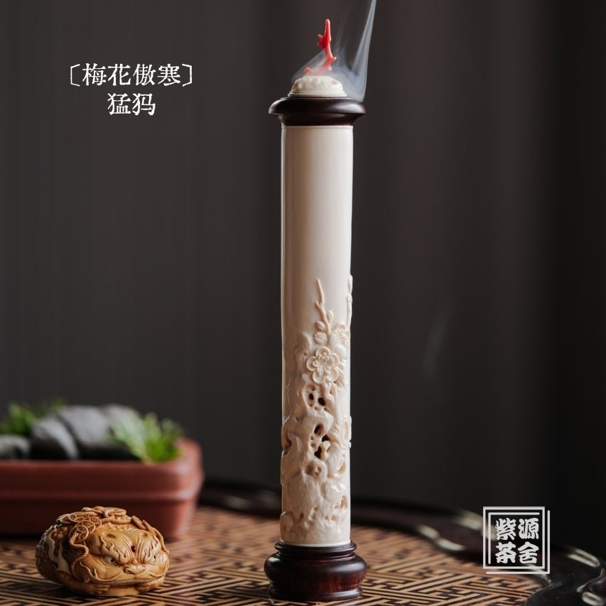 牙質凝脂生暈,爐身浮雕梅花傲寒,梅花清奇脫俗。燃香時青煙穿鏤過隙,恍若瓊樓玉霧,一案之間,盡得清韻。