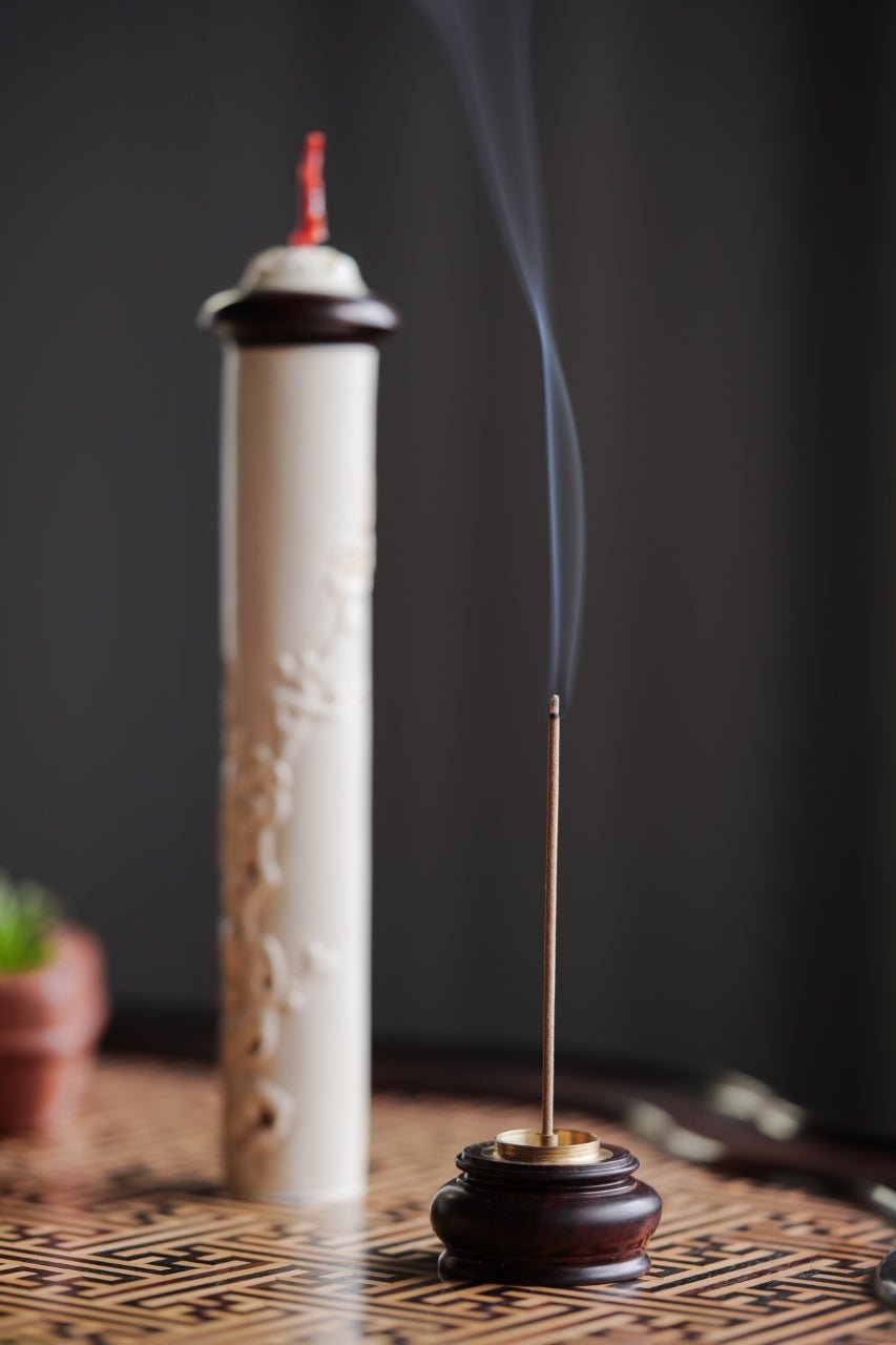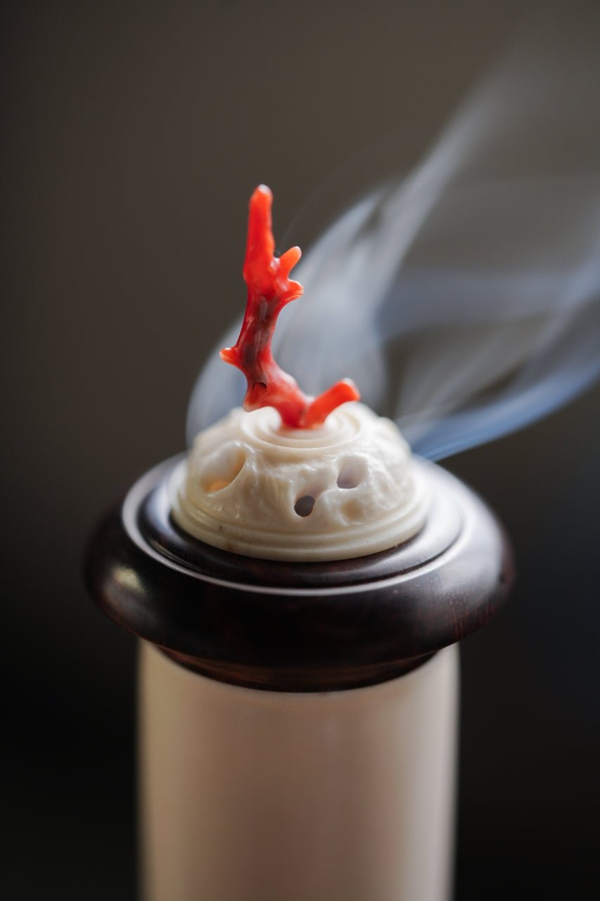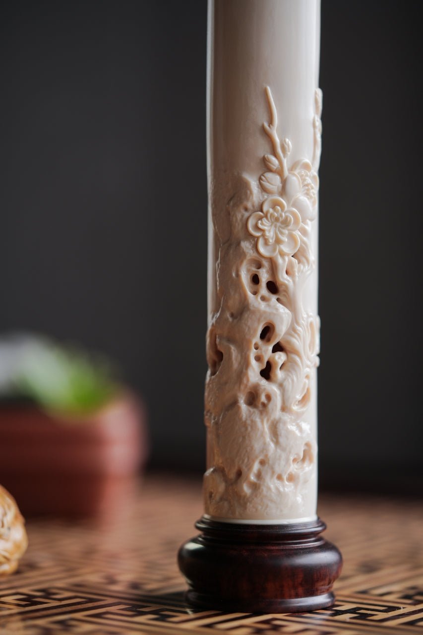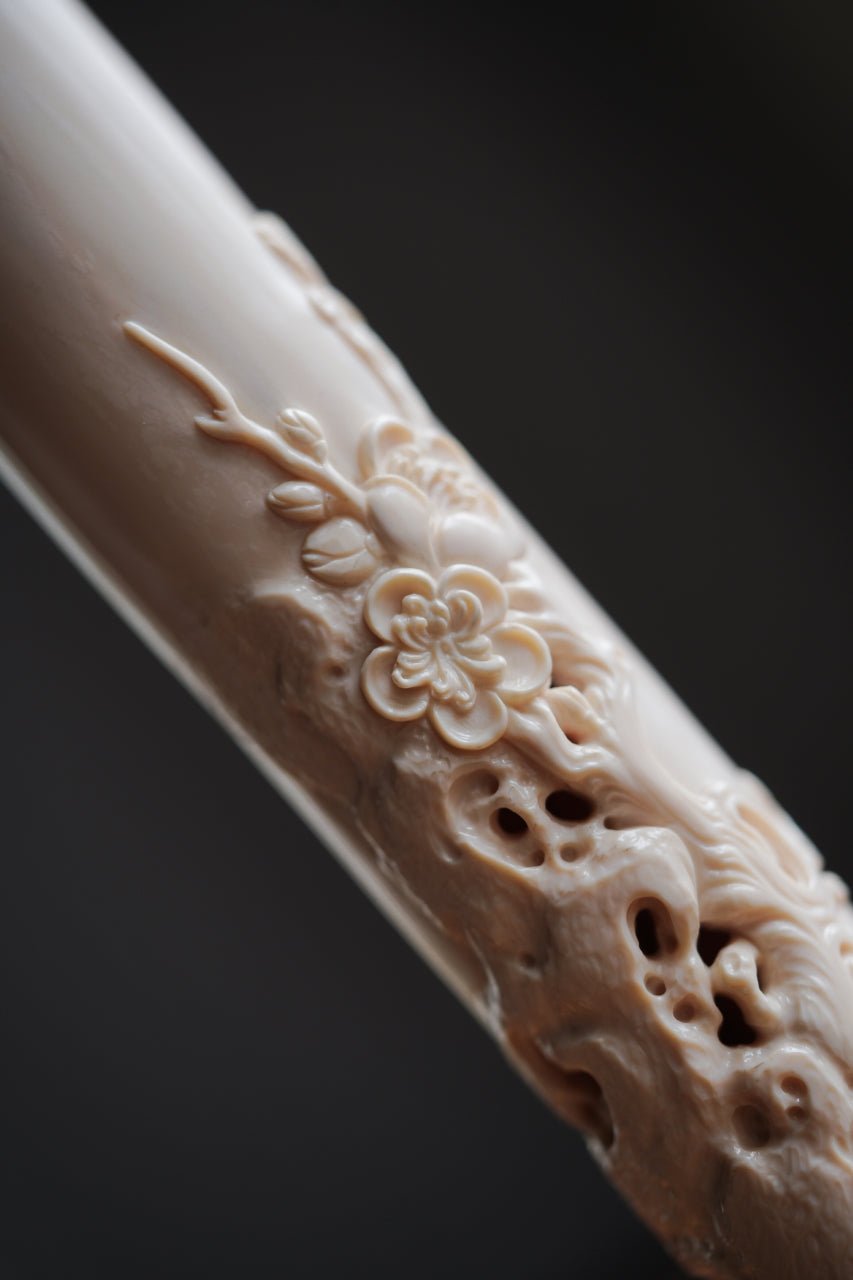 牙質凝脂生暈,爐身浮雕梅花傲寒,梅花清奇脫俗。燃香時青煙穿鏤過隙,恍若瓊樓玉霧,一案之間,盡得清韻。