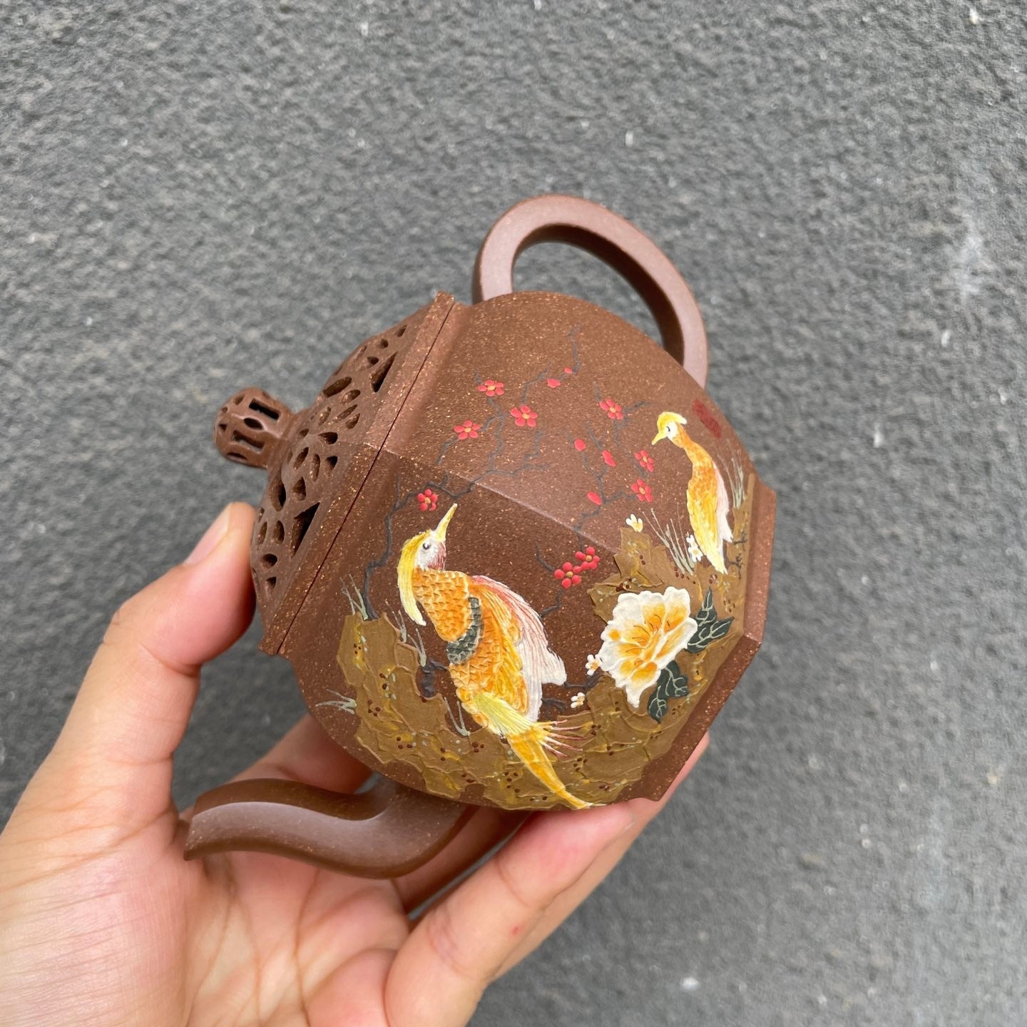 此壺中國傳統蓮年有餘體現,雙層鏤空,重工雕刻,壺身加泥繪裝飾,生動有力!