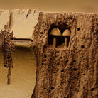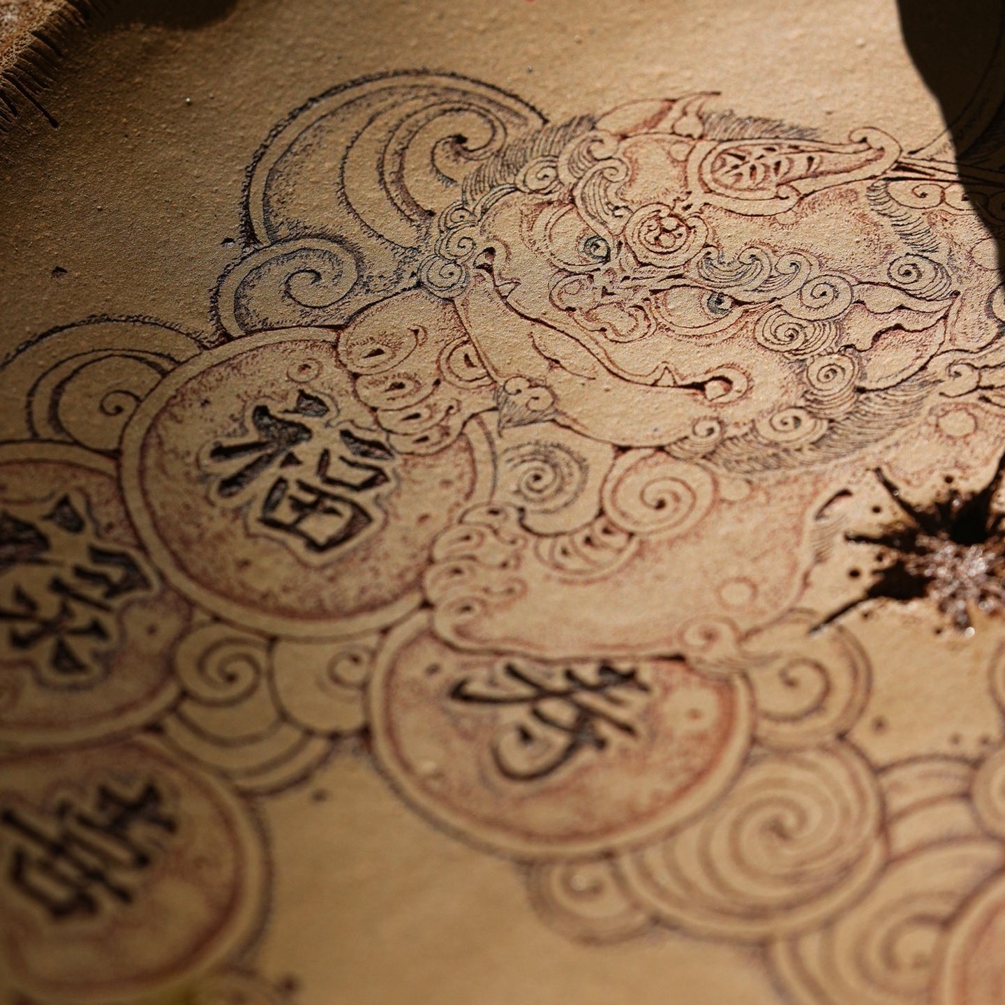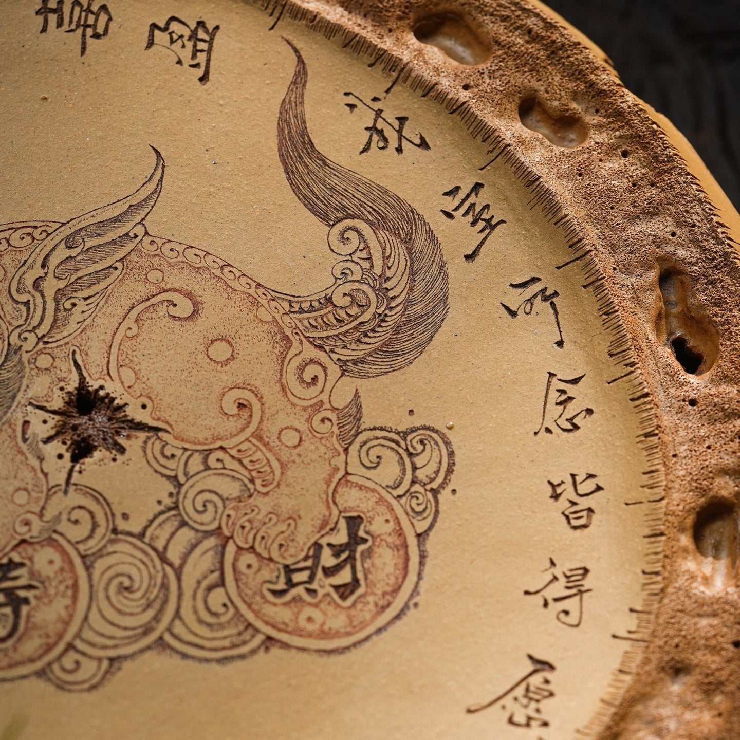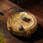 茶盤形似竹樁的切面,側面的竹節為出水口,盤面上盤踞的金蟾,亦可作為蓋置或茶寵擺件