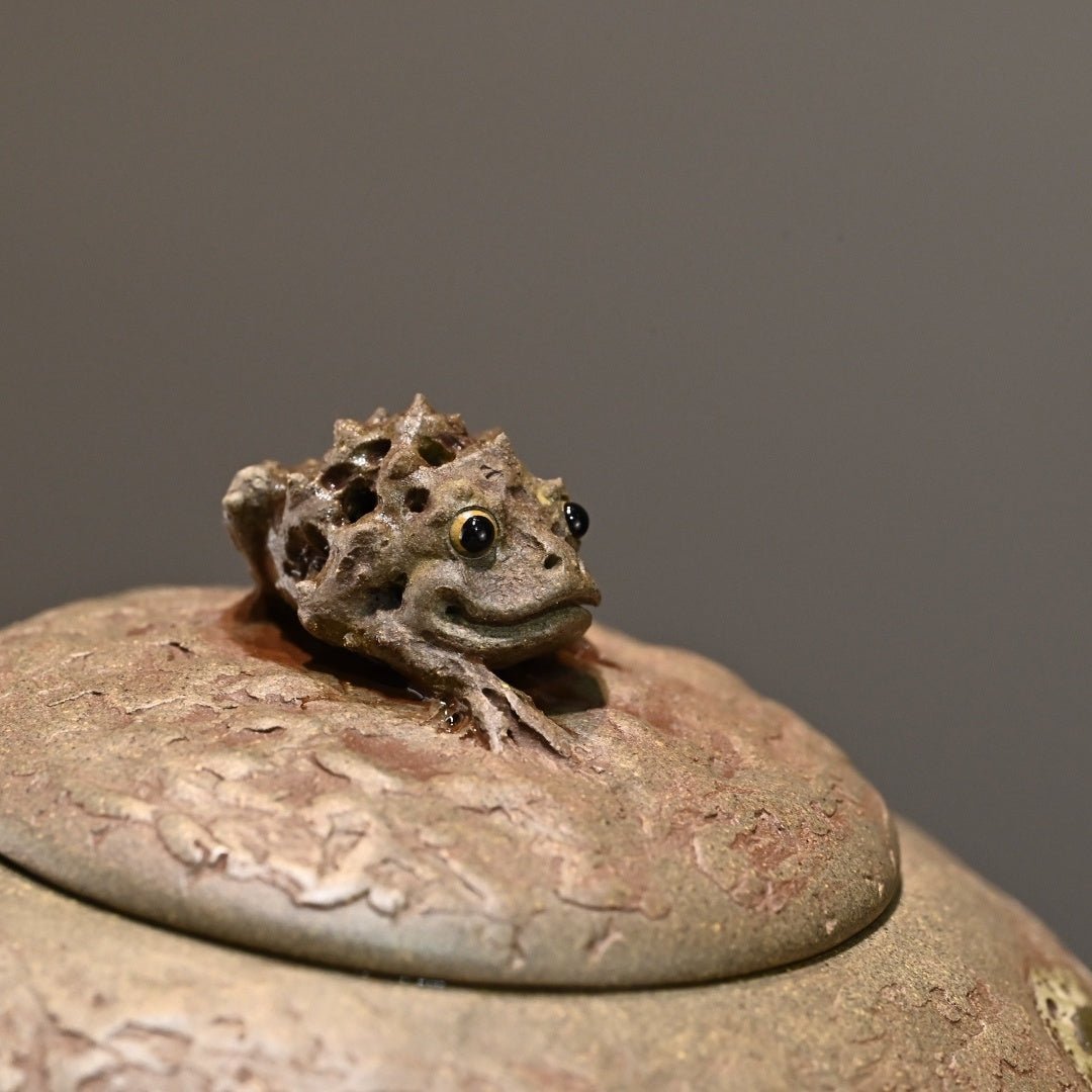 The golden toad leaned over the lid of the pot, extremely exquisite, and the shape of the spring pot is ever-changing. The two complement each other, combining the shape and decoration organically. The composition is derived from reality and the skill is in the sky.