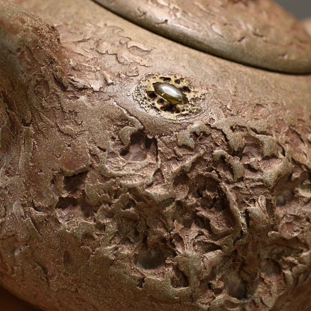 金蟾蜍俯身立於壺蓋之上,異常精妙,供春壺造型上千變萬化,兩者相得益彰,將造型和裝飾有機地結合起來,組成物源於現實,技巧於天齊。