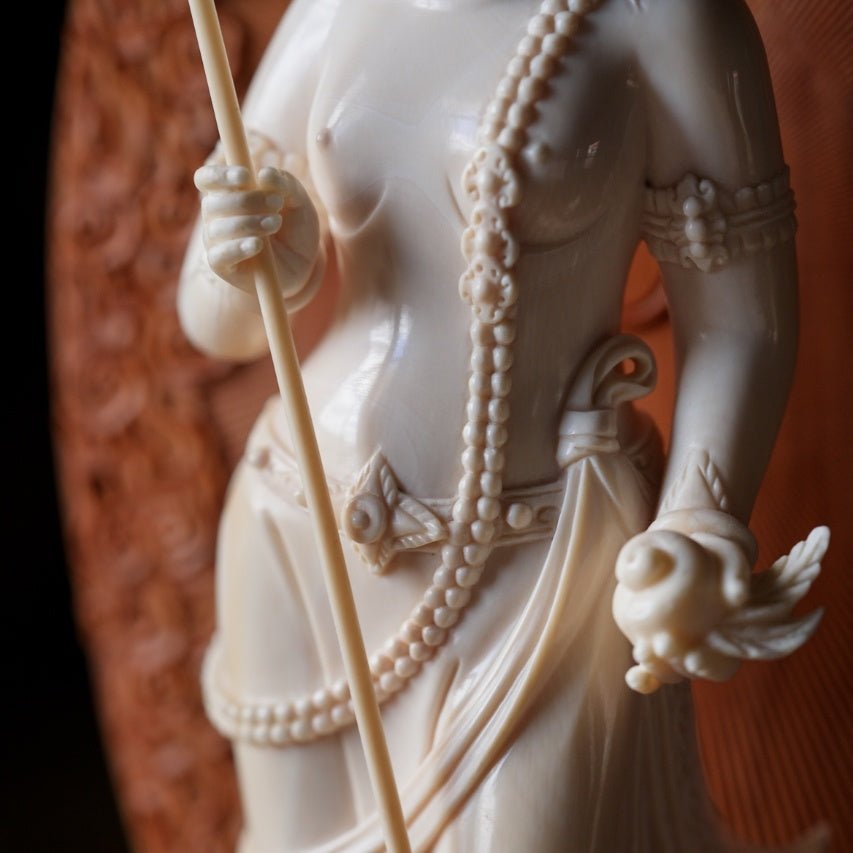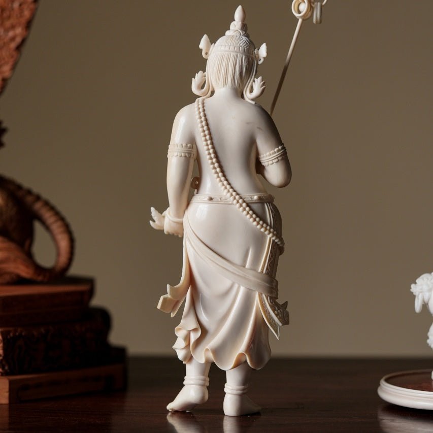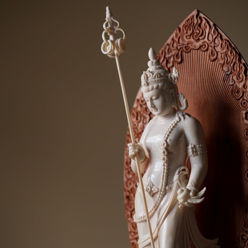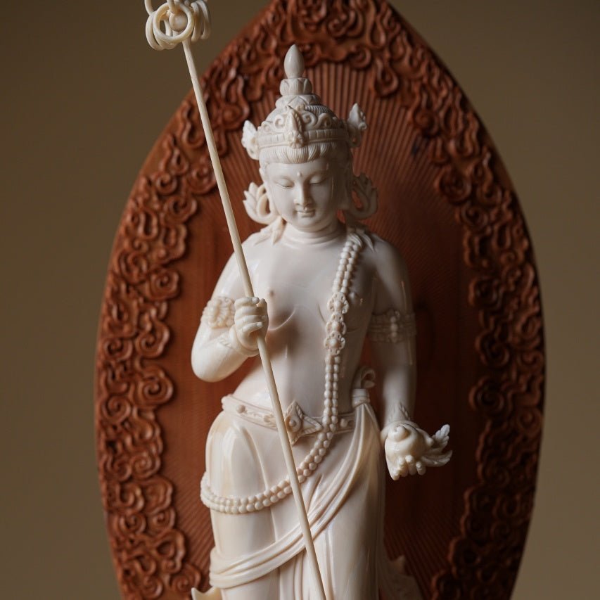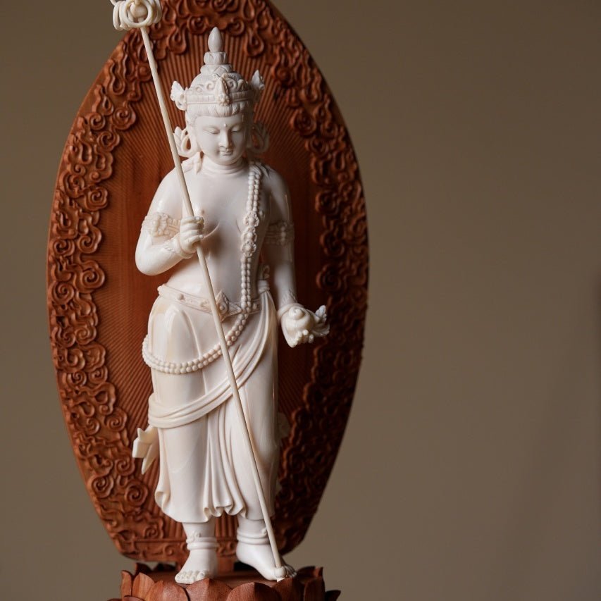 牙色皎若蓮台,法相慈悲垂目。手持九環金錫振幽冥,衣紋層疊似水波。禪案供之,明心見性。