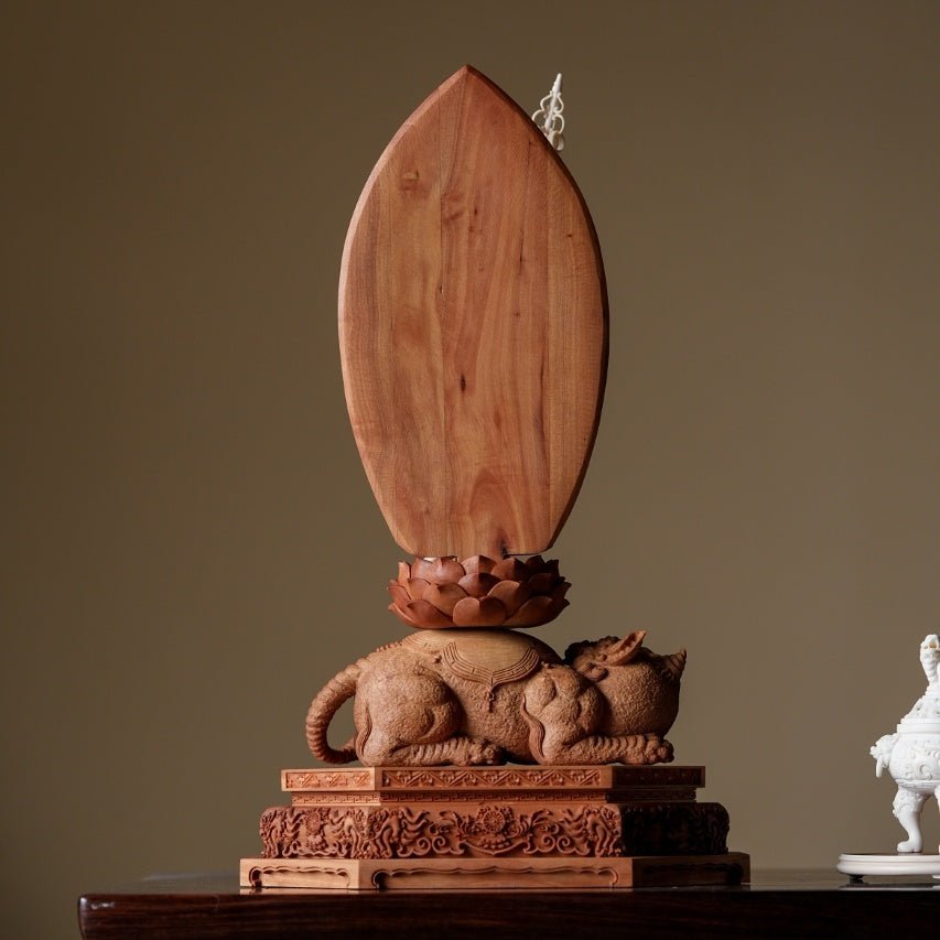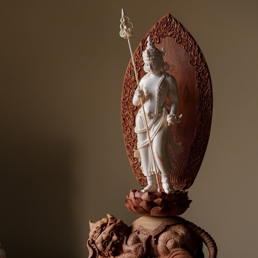 Its teeth are as bright as a lotus pedestal, and its compassionate visage has downcast eyes. Holding a nine-ringed golden tin staff that rouses the netherworld, its layered robes ripple like water waves. Enshrined on a meditation table, it helps one attain clarity of mind and realize one's true nature.
