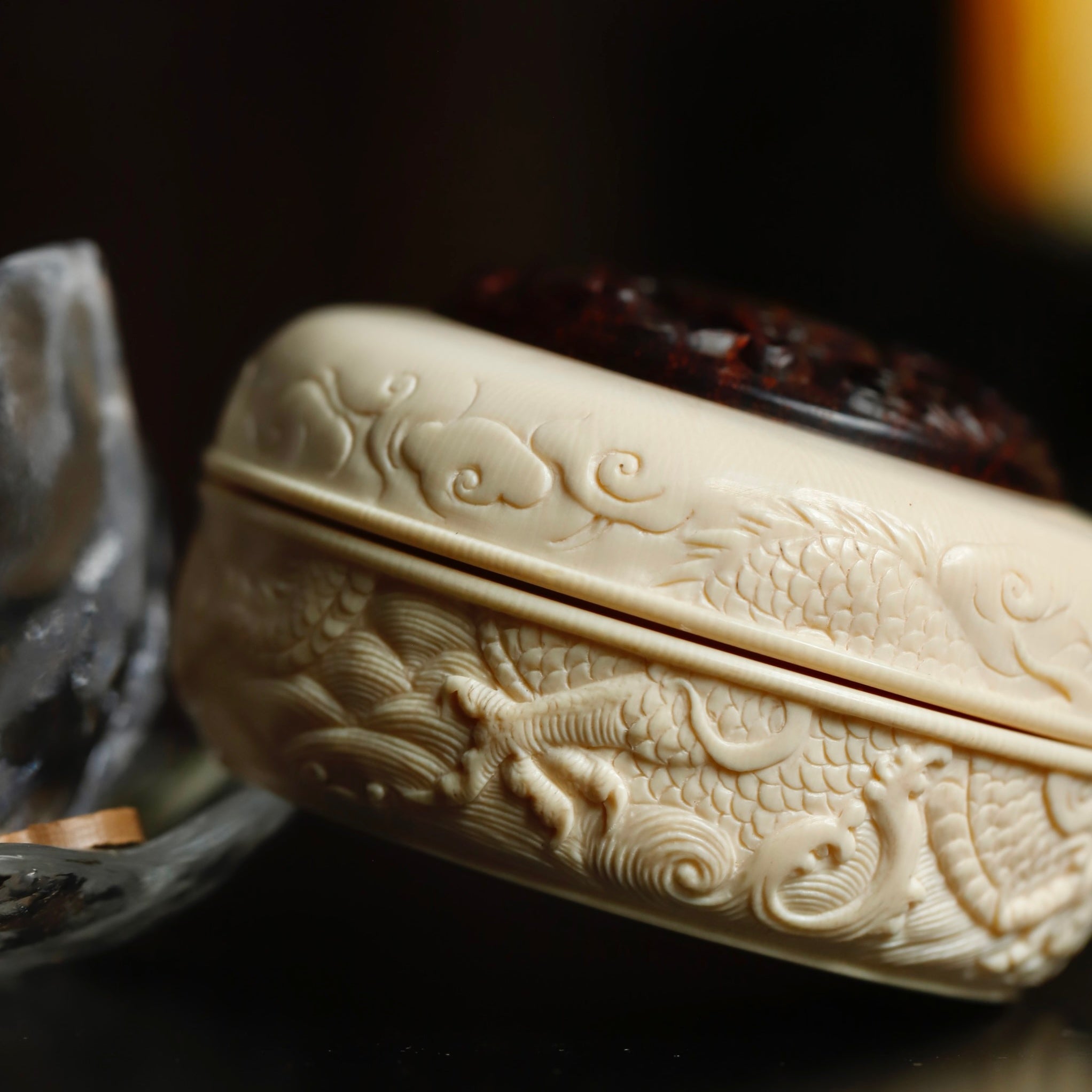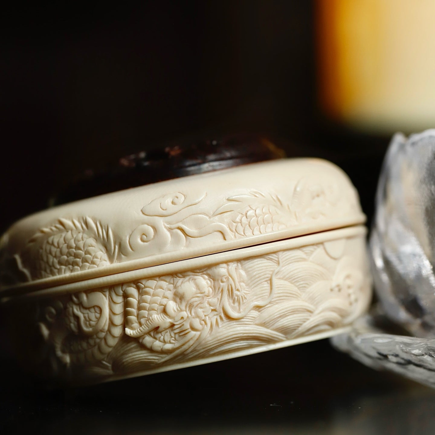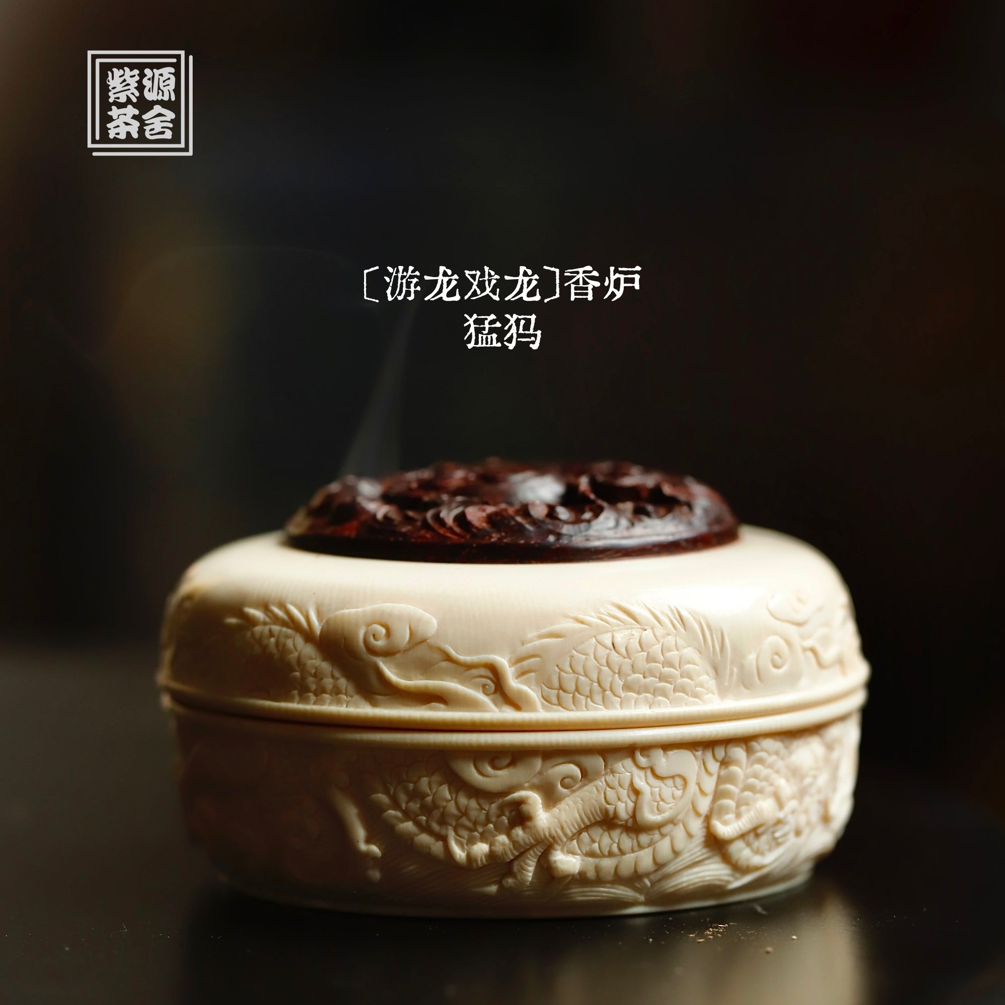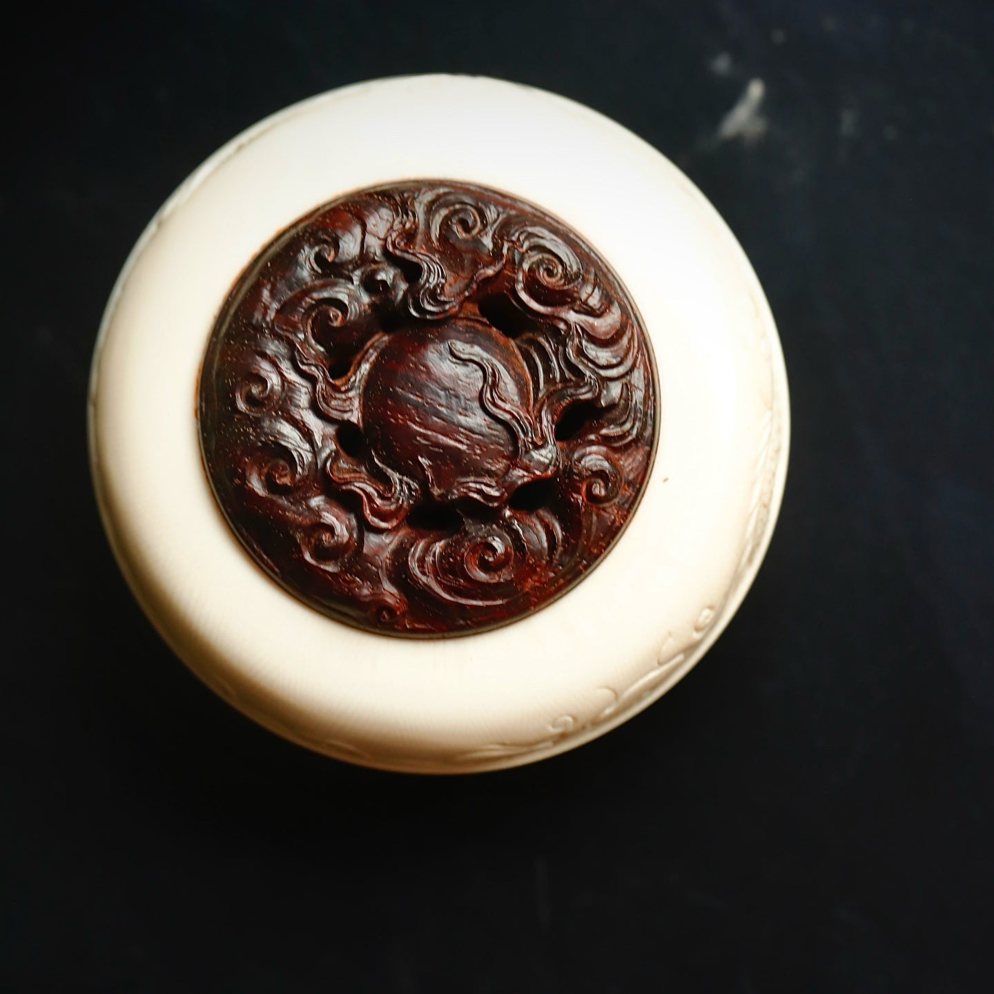 牙質瑩潤如雪,刀工遒勁藏鋒。遊龍穿雲吐珠,鱗爪飛揚帶風。懸於襟前,可鎮心魄,如攜祥瑞,賞玩皆宜,爐蓋龍珠取材印度小葉紫檀製。