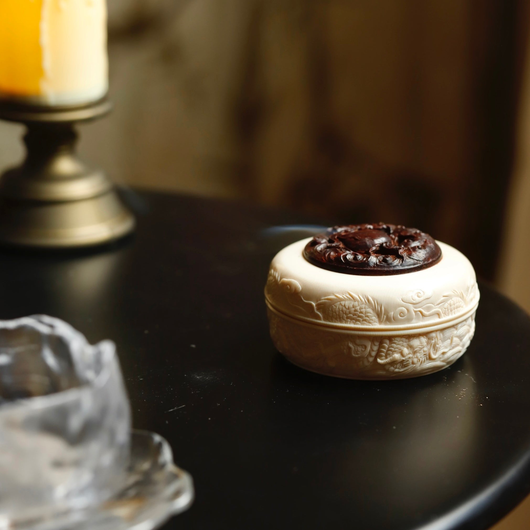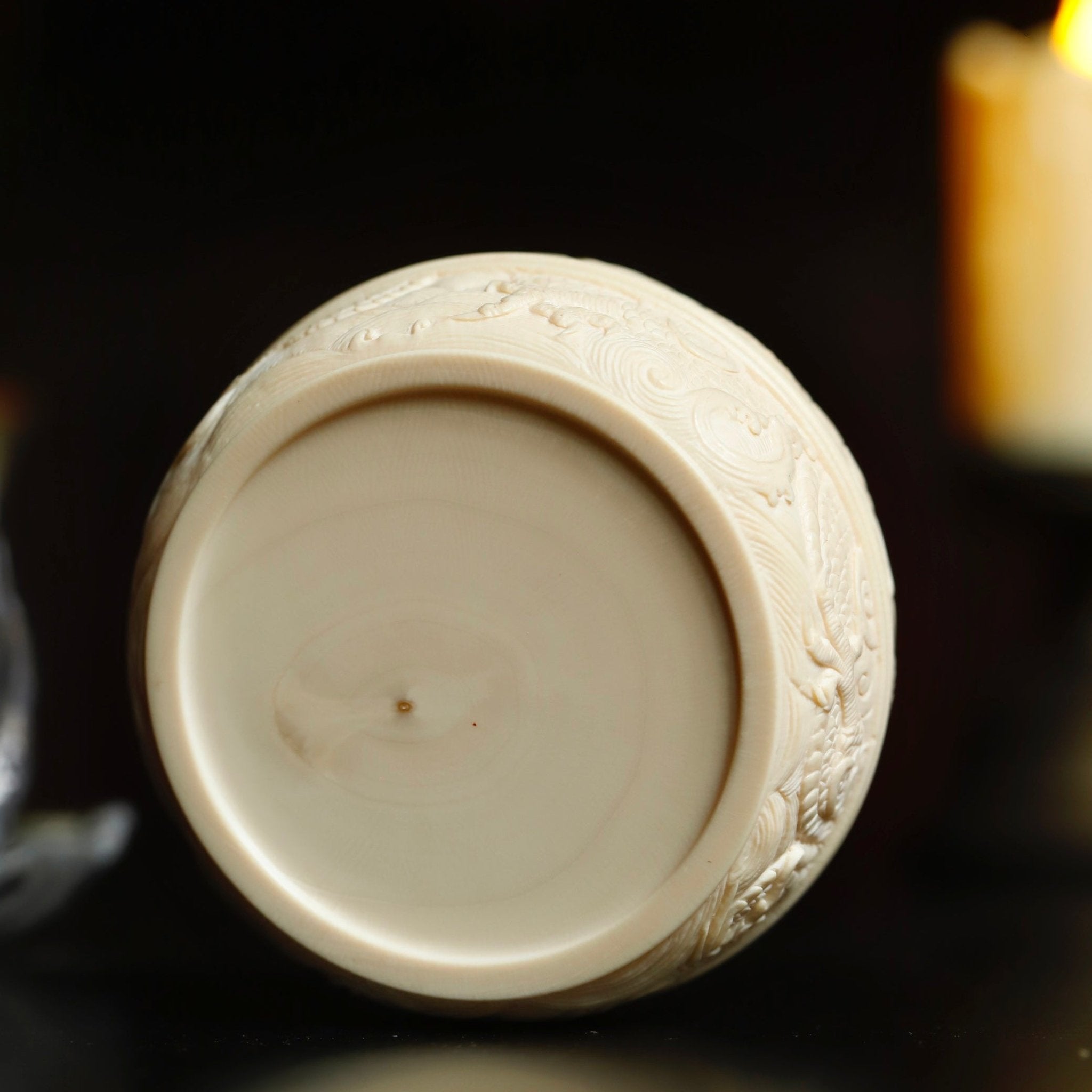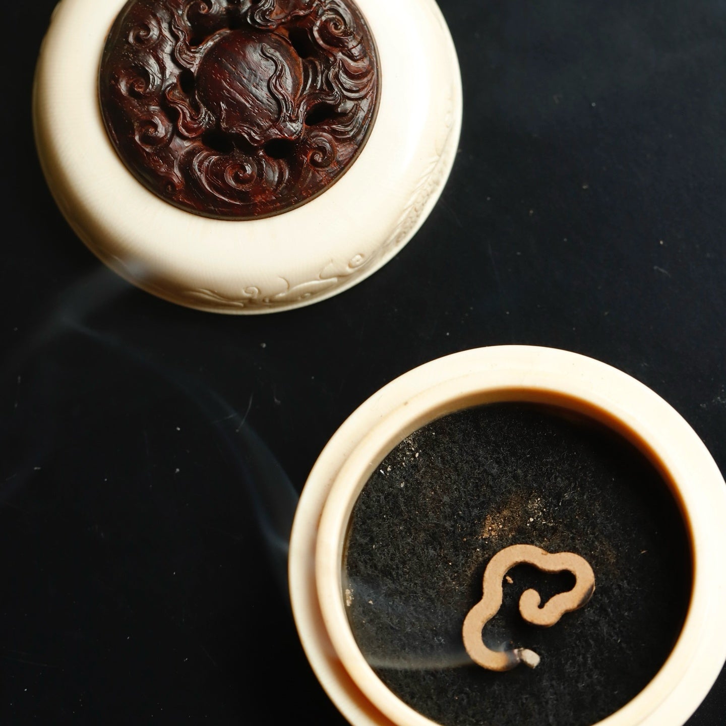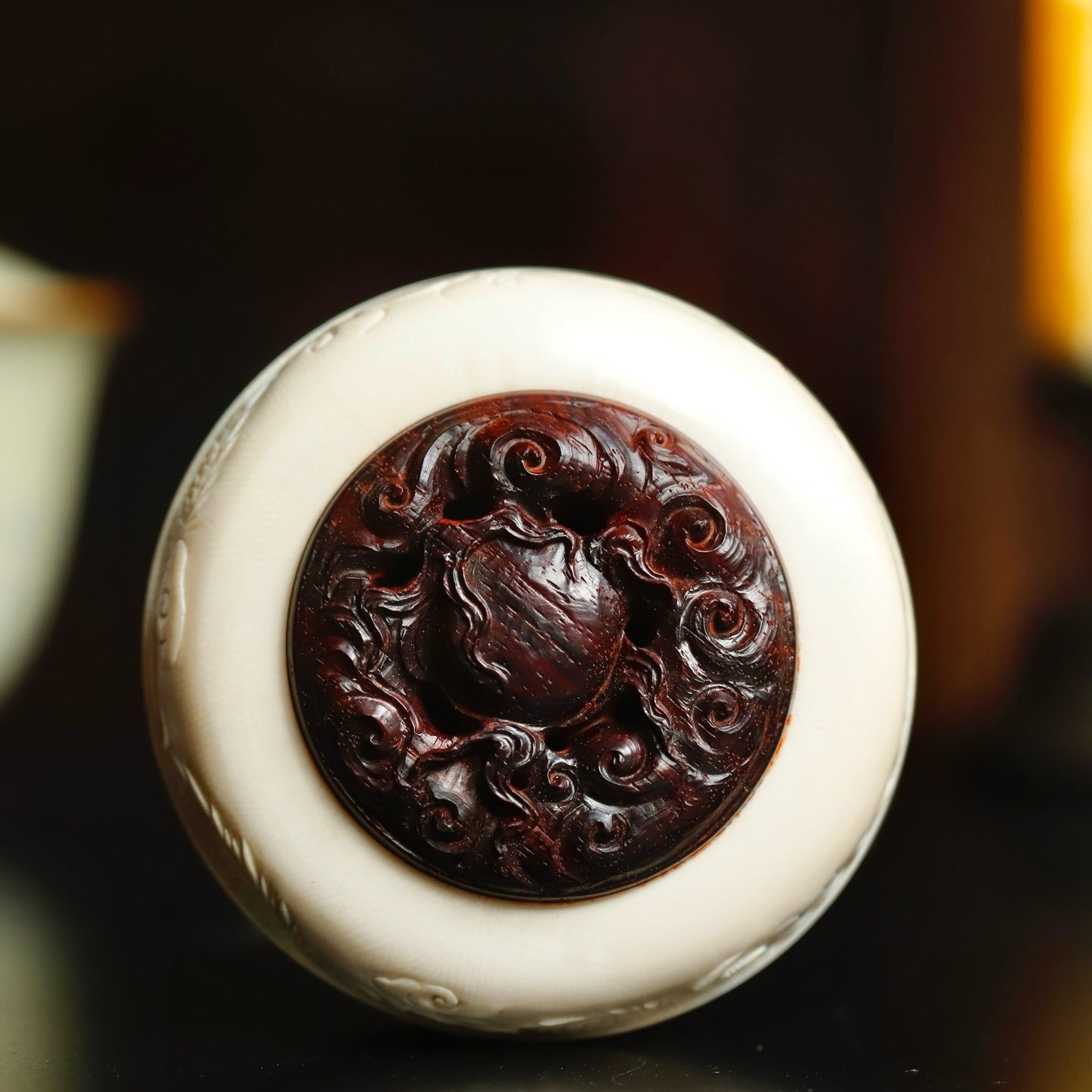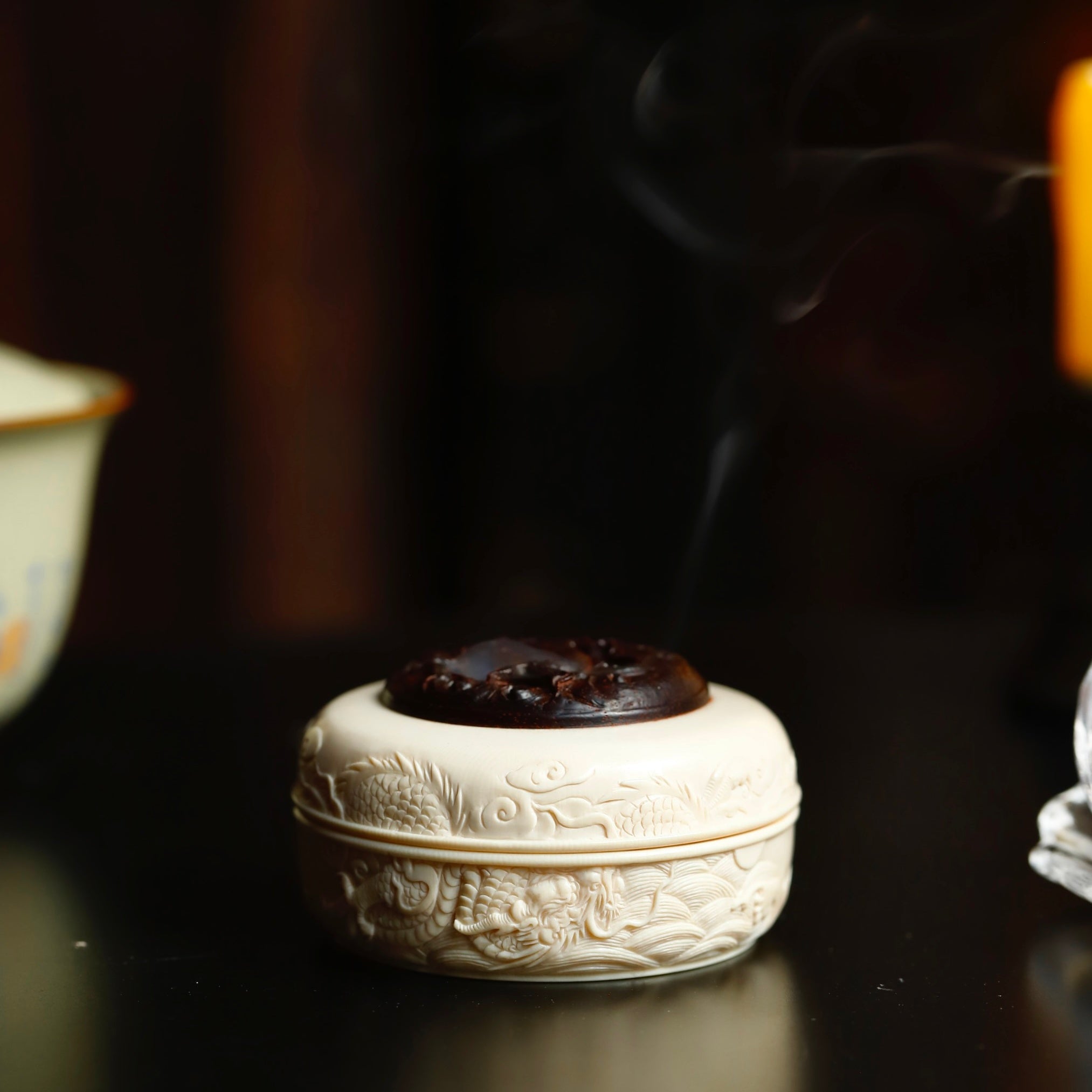 牙質瑩潤如雪,刀工遒勁藏鋒。遊龍穿雲吐珠,鱗爪飛揚帶風。懸於襟前,可鎮心魄,如攜祥瑞,賞玩皆宜,爐蓋龍珠取材印度小葉紫檀製。