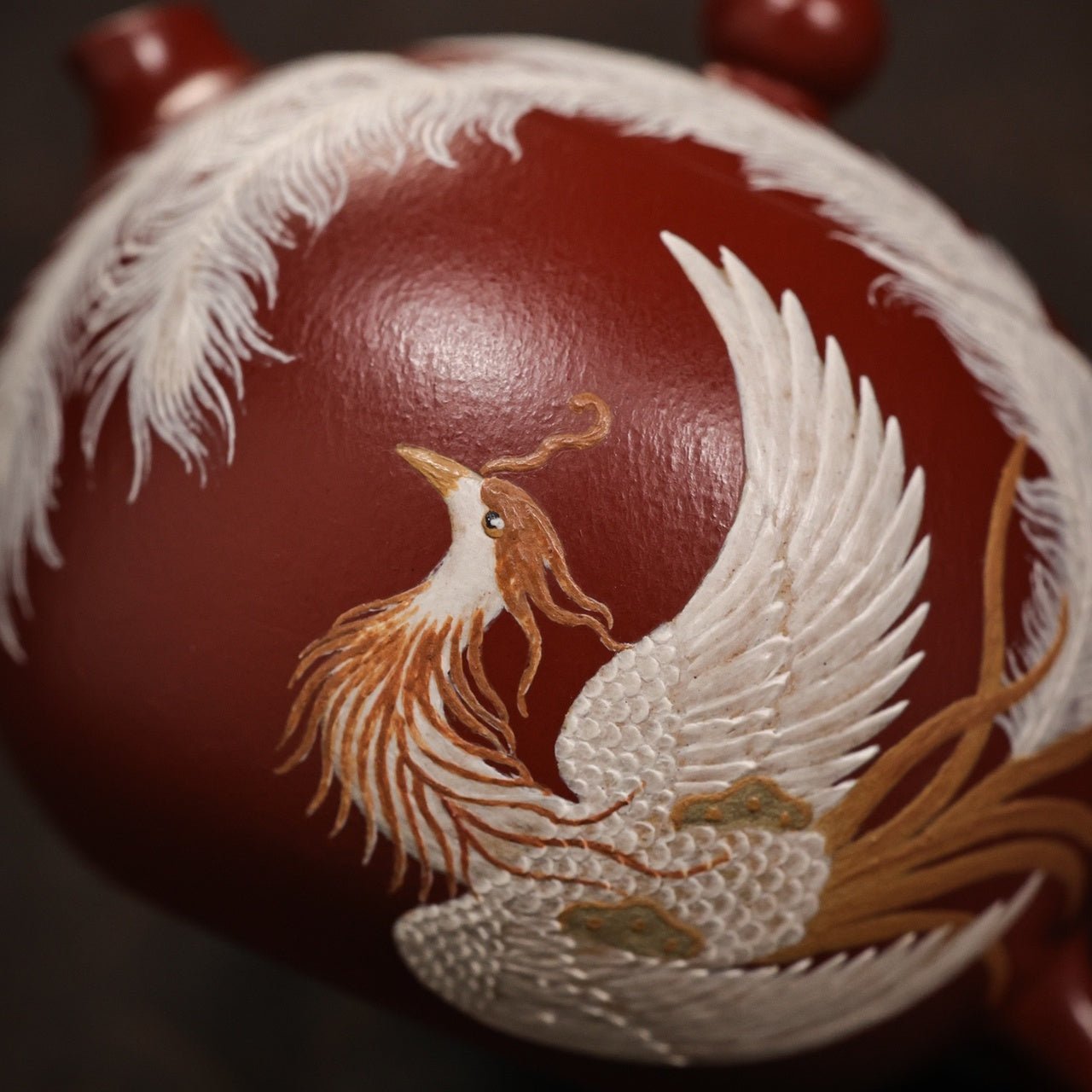 壺身正面以不同泥料繪出鳳凰,鳳凰尾巴延伸至蓋面,栩栩如生,令人陶醉,壺身背面泥繪小字:「有鳳來儀。」呼應畫面,更為茶壺增添一份色彩。