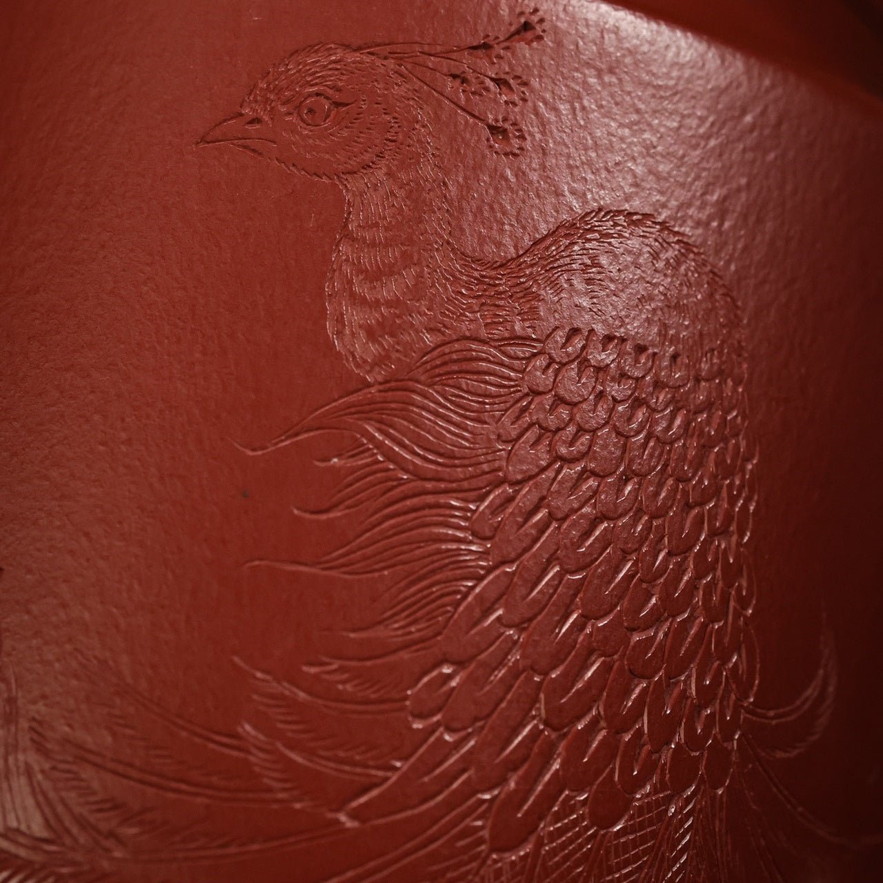 壺身正面細刻孔雀,惟妙惟肖,尾巴延伸至壺背面,讓畫面更有整體性。