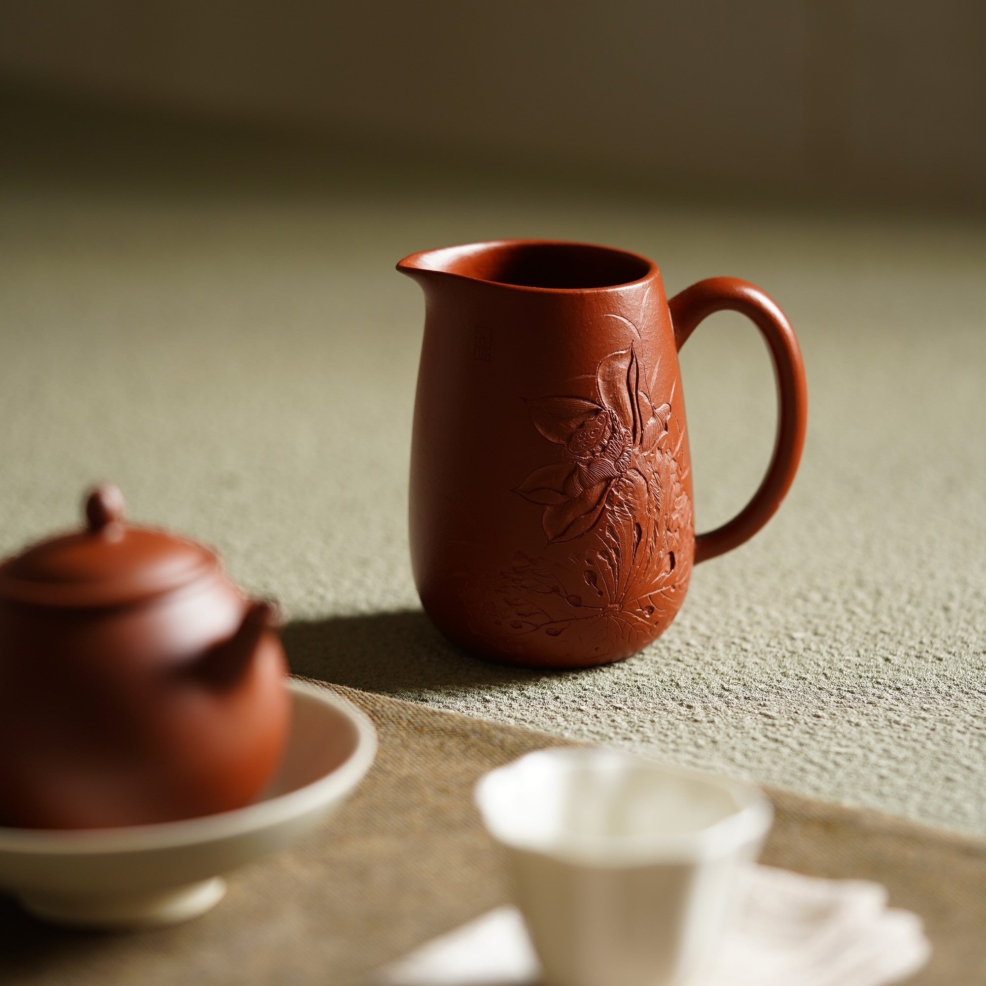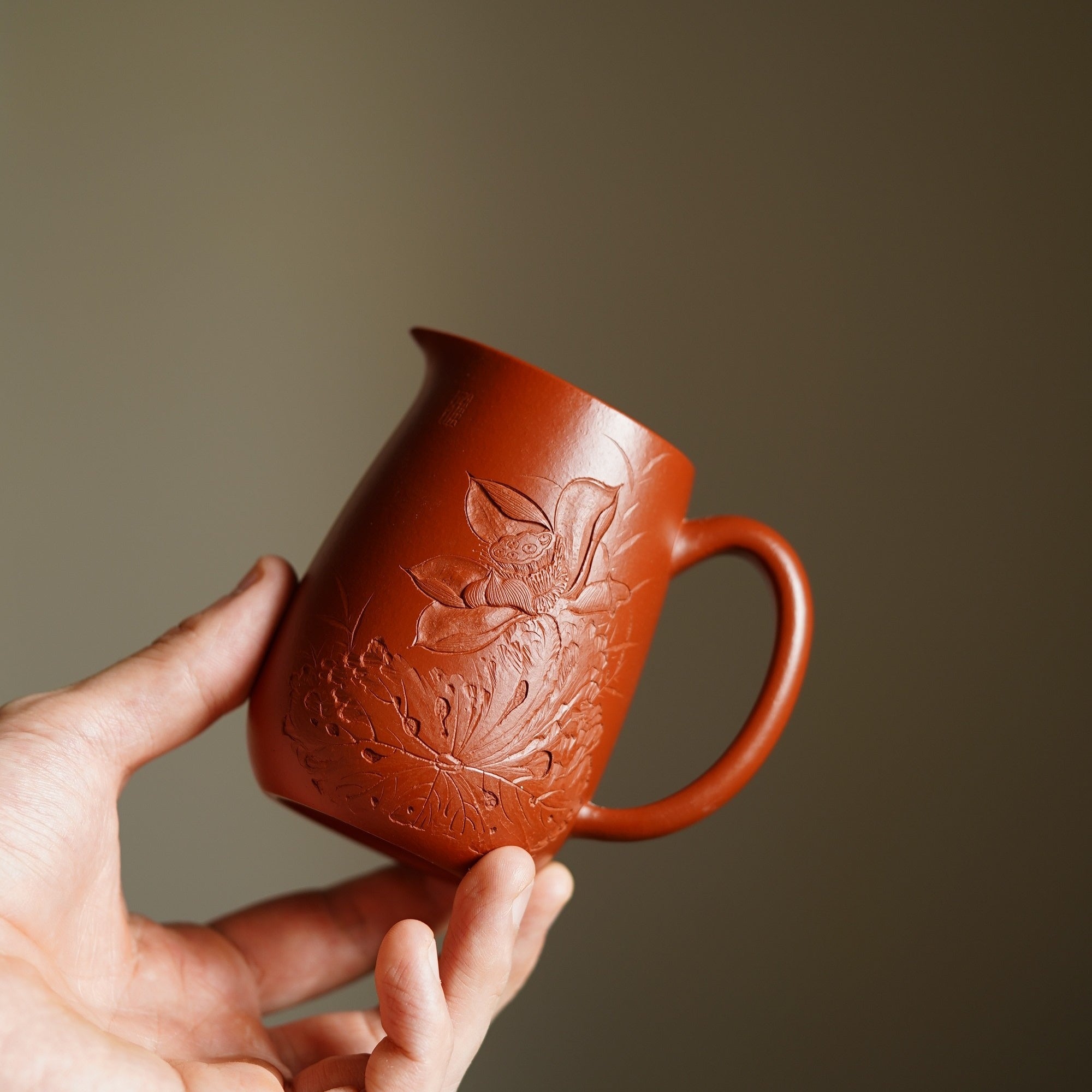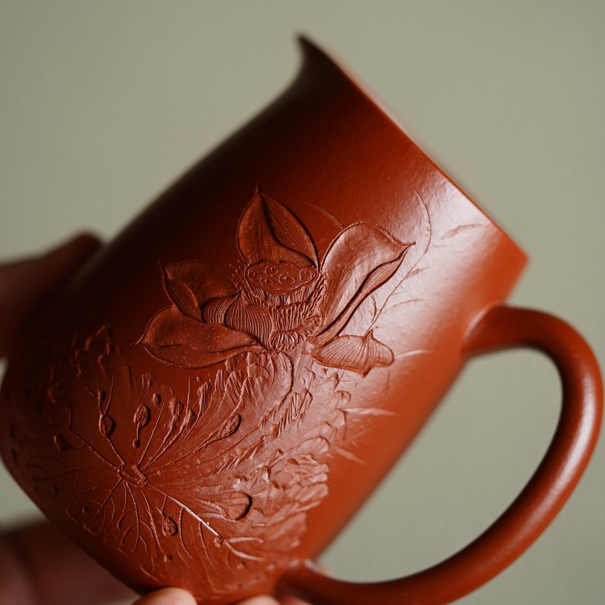 Crafted from red clay, the lotus is meticulously carved in relief, creating a lifelike effect. As a pot of tea pours, the lotus dances with the fragrance of the tea. This small vessel holds a world of its own; holding it evokes the tranquility of a Jiangnan rain.