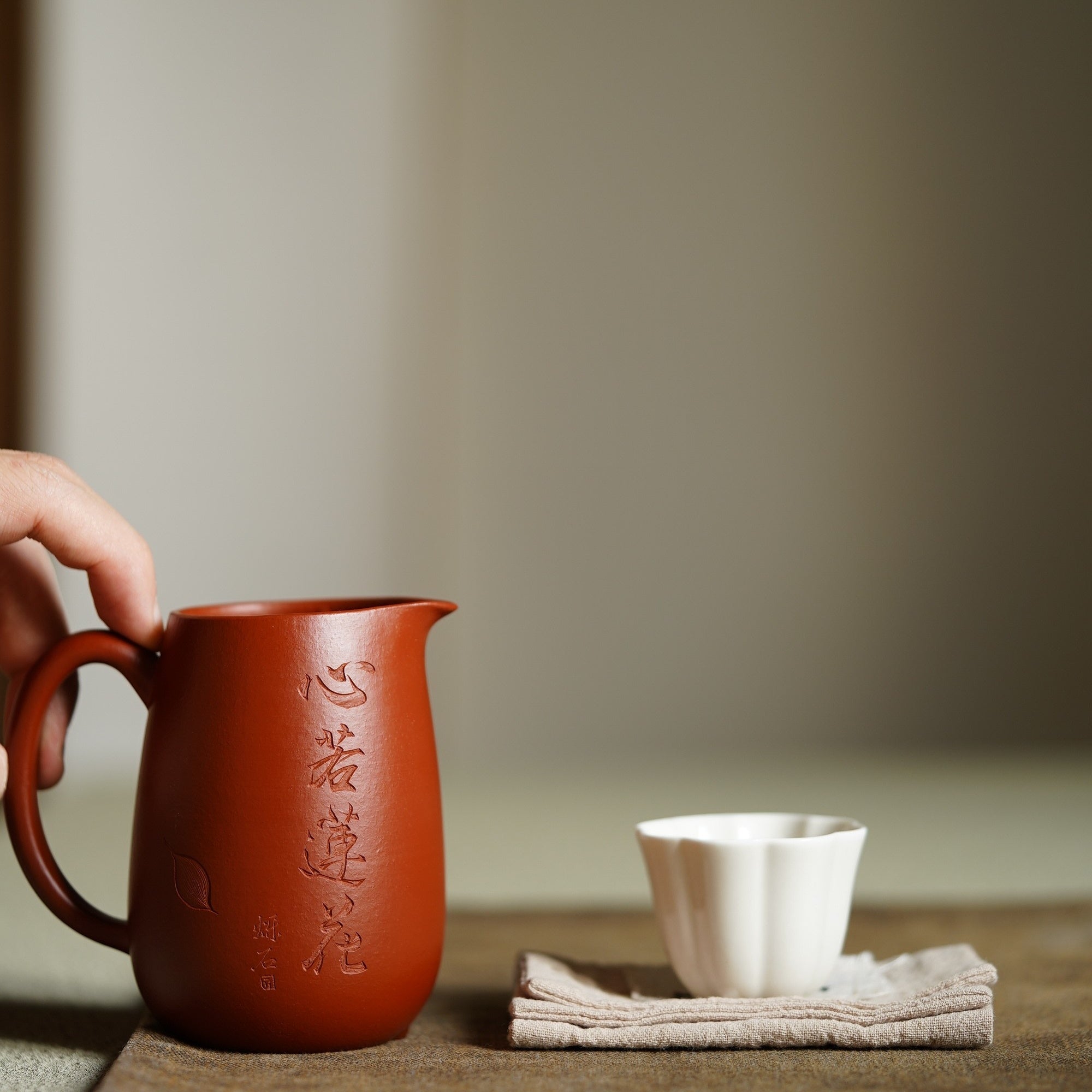 以朱泥為骨,精工細刻浮雕蓮花,栩栩如生。一壺茶湯傾瀉間,荷蓮與茶香共舞。器小卻藏天地,持握便是江南一場微雨後的閒適。