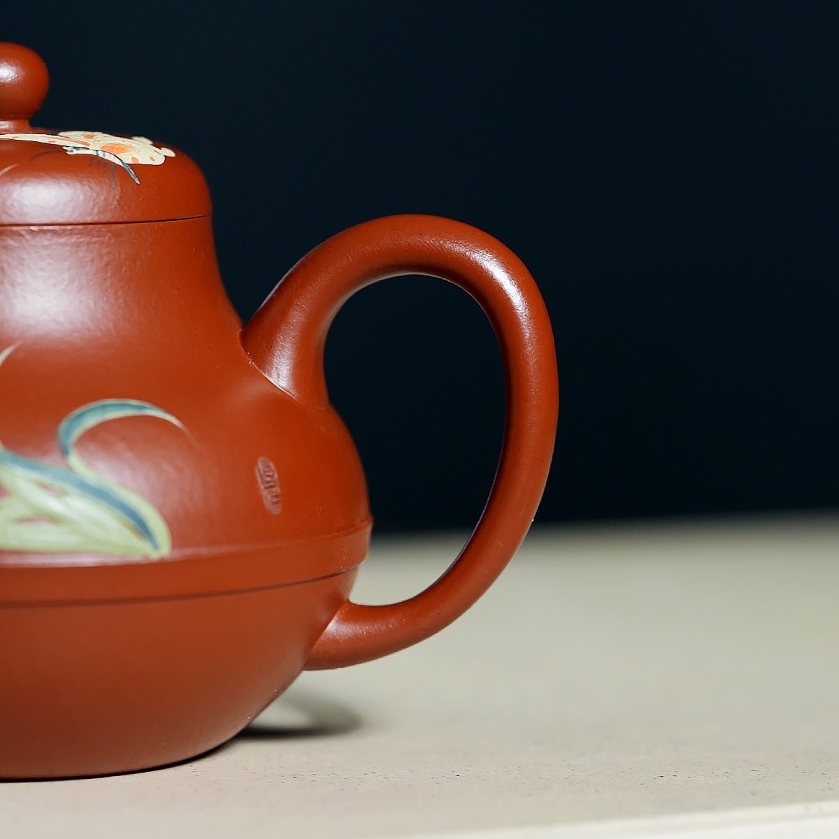 此壺色澤鮮明,壺身收斂與舒展並濟,形狀似梨而矮,俏皮可愛,盡顯玲瓏小巧,縱觀整個壺型的型、氣,構成了一種造型美,給人以精神上的愉悅。壺身梨皮收縮褶皺極具美感,壺體的每個部分都獨立鮮明,線條緩衝流暢。