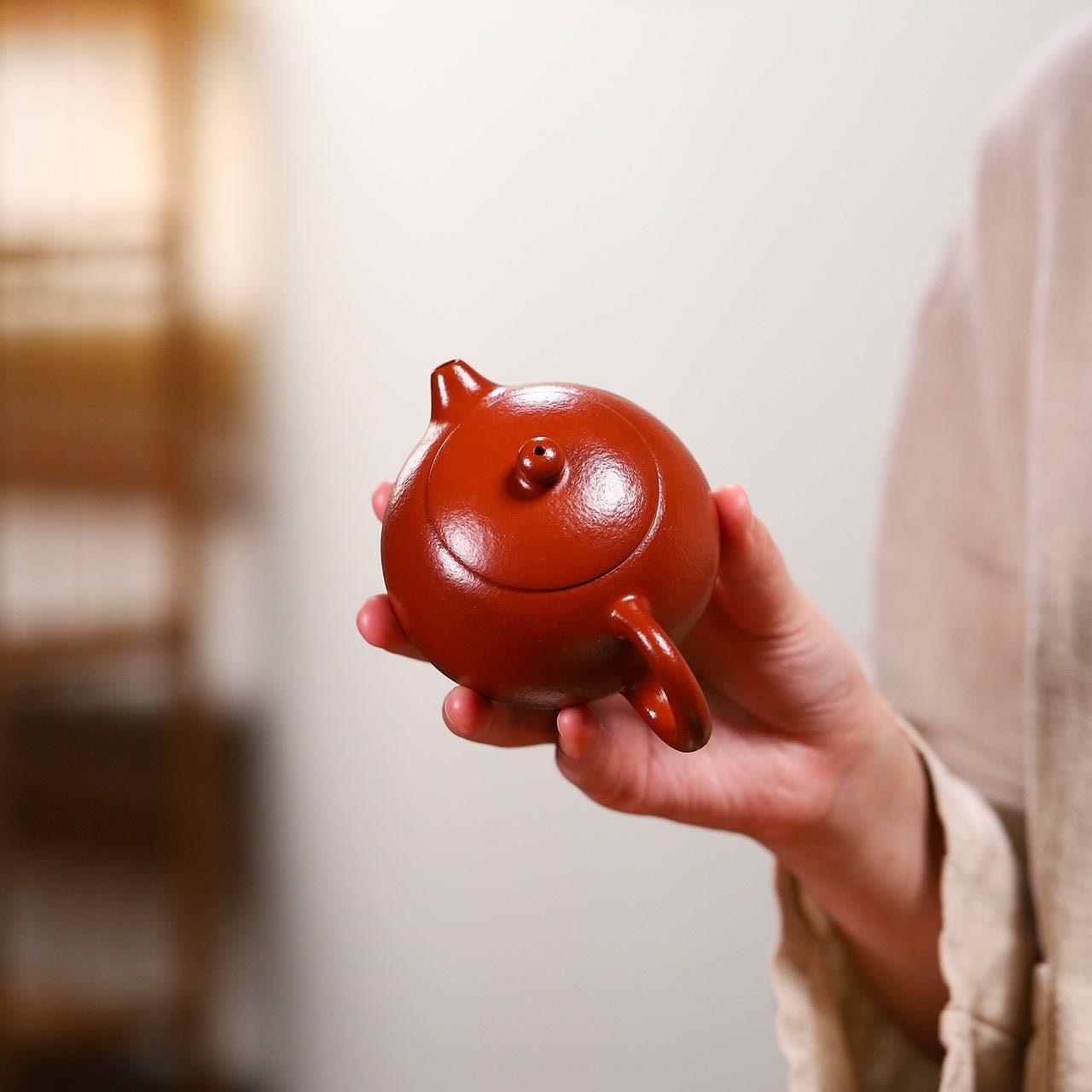 大紅袍礦石剛挖出來時是鵝黃色,製作成壺後變色為瑰麗的朱紅色,紅艷奪目,氣質高雅,谷皺周身,色澤效果純正細膩。