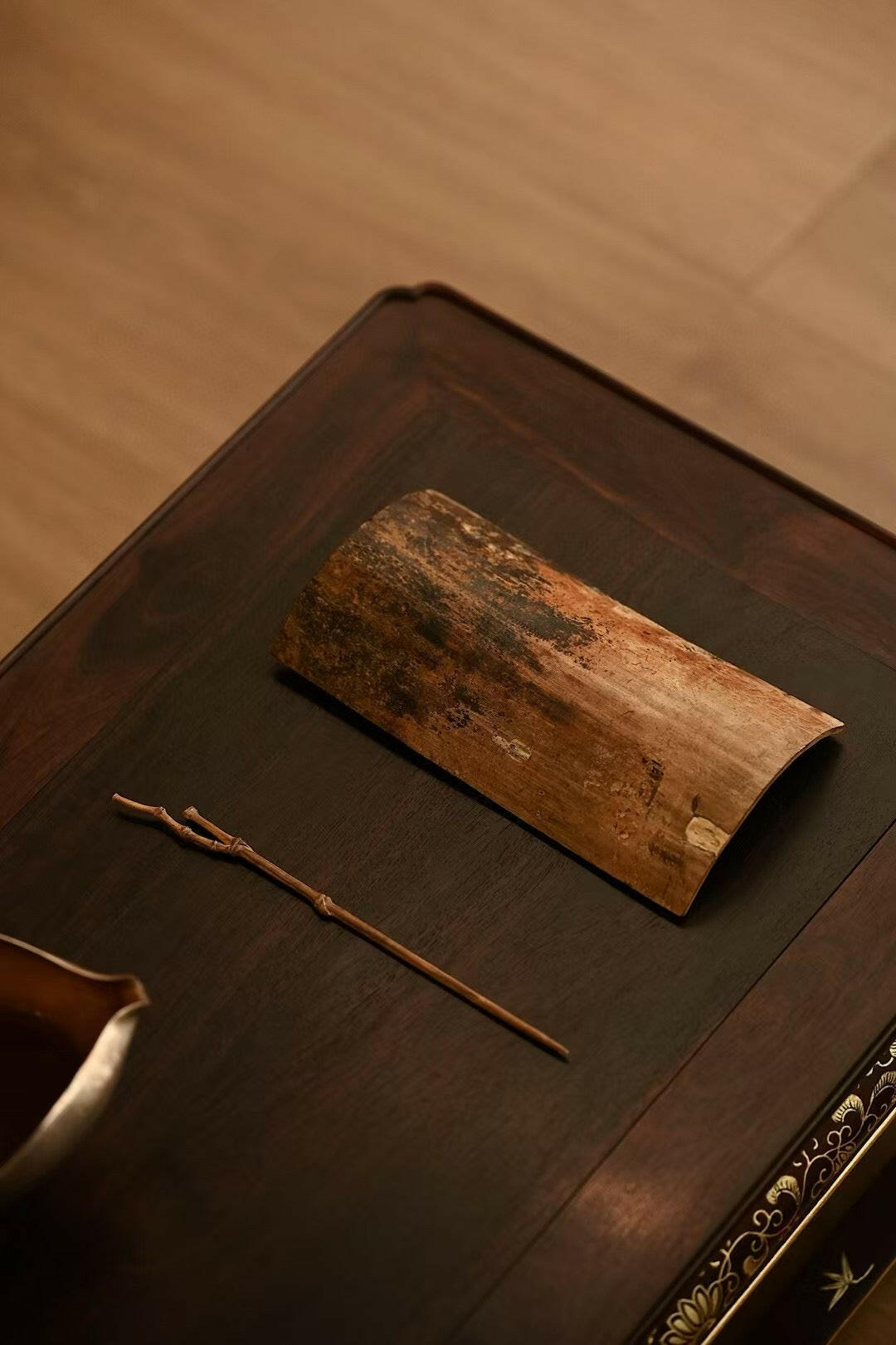 精選咖料,色澤溫古和煦,邊角打磨溫潤趁手,竹葉通透清朗,竹節生動形象,為素雅茶席之佳選。