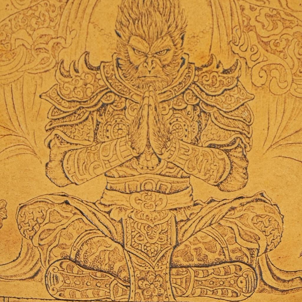 After traversing Black Wind Mountain, Yellow Wind Territory, Little Western Paradise, Purple Cloud Mountain, and Flame Mountain, he defeated Erlang Zhenjun and defeated the Monkey King on the windswept Mei Mountain. He then successfully gathered all the great divine spirit roots and reached the summit of Flower and Fruit Mountain. Following the guidance of the old monkey, he shattered the remains of the Great Sage. Before the old monkey, symbolizing the gods and Buddhas, placed the golden hoop back on the man's head, he opened his blazing eyes.