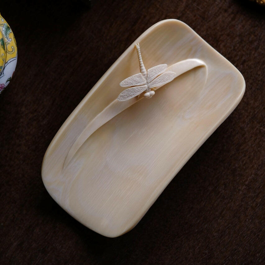 猛獁料質溫潤,原皮裹雪色蒼皴肌理,內壁淺剔青蜓立荷風。釉盞波光間,木案凝駐一格蜻尾點破春潭的靜謐禪畫。