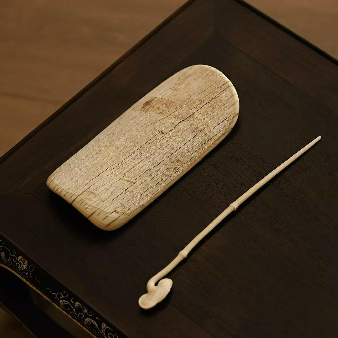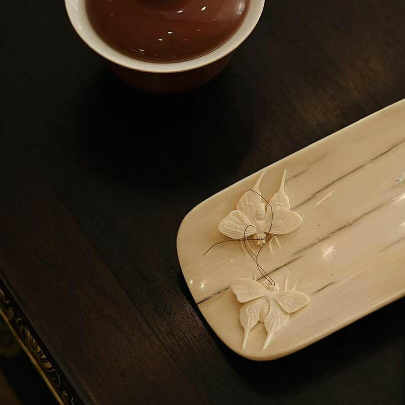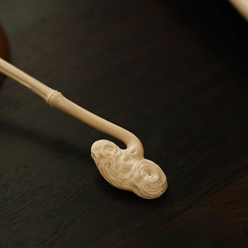 The material is natural and smooth, with the skin left on the back, and the texture is delicate and natural. The front is carved with a pair of butterflies, dancing gracefully, romantic and colorful. The Ganoderma lucidum tea pick symbolizes auspiciousness and has infinite meaning when placed on the tea table.