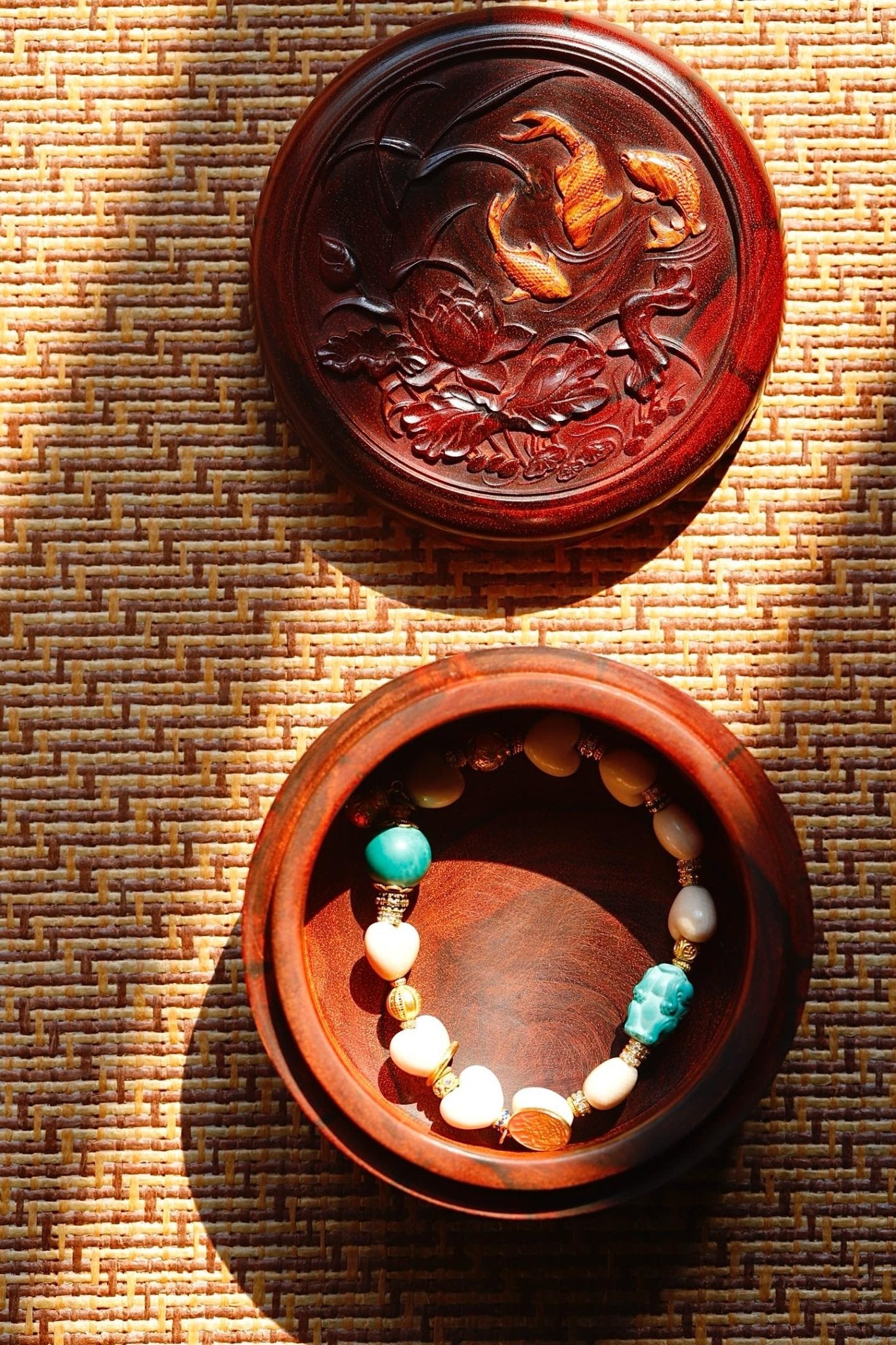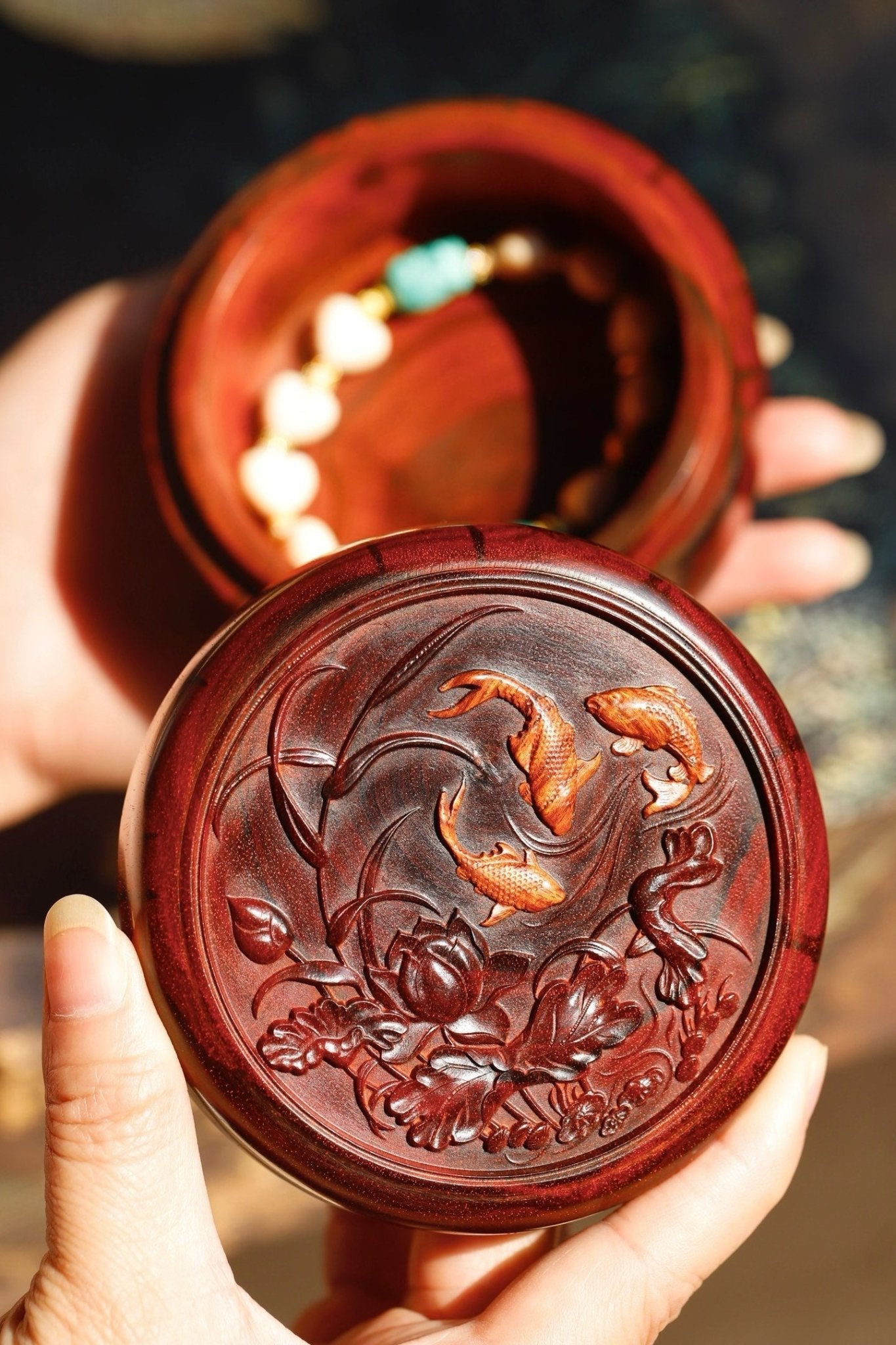盛开的荷花充满生机,鱼儿跳跃。自然和谐之美。搭配极致的手工艺,好不热闹的欢喜画面,镶嵌海南黄花梨鱼儿,工艺精湛惟妙惟肖,令观赏价值和收藏价值并存。