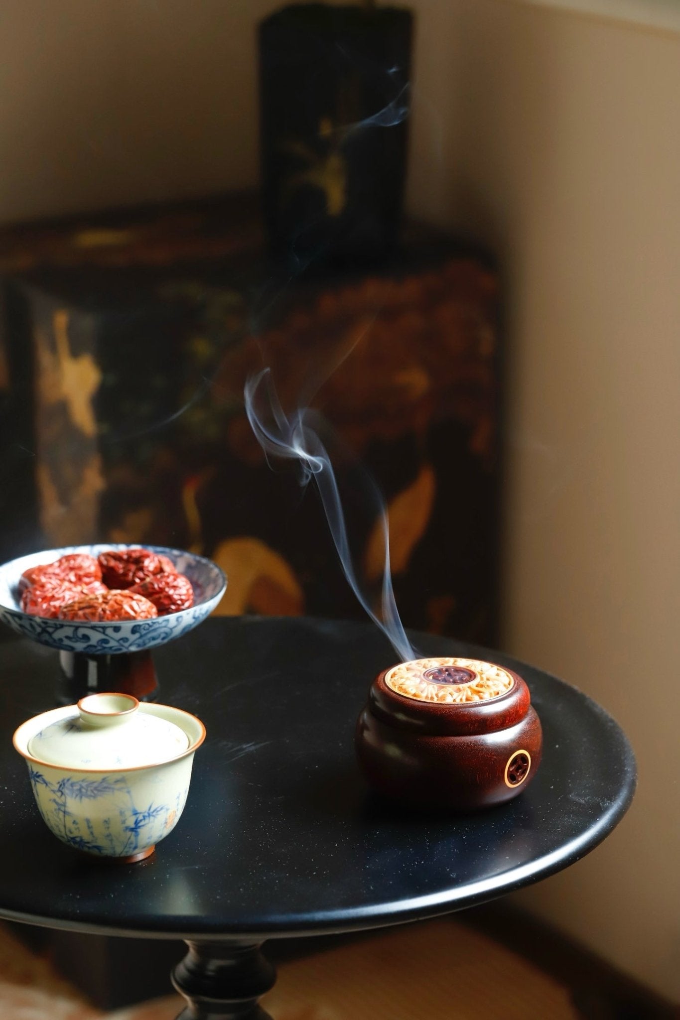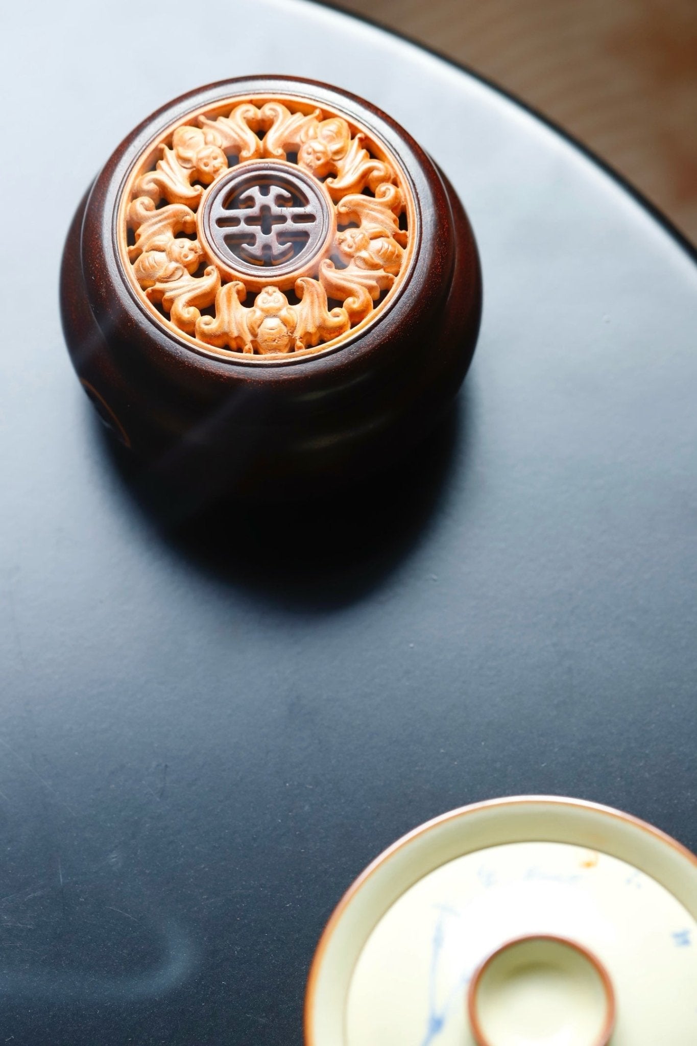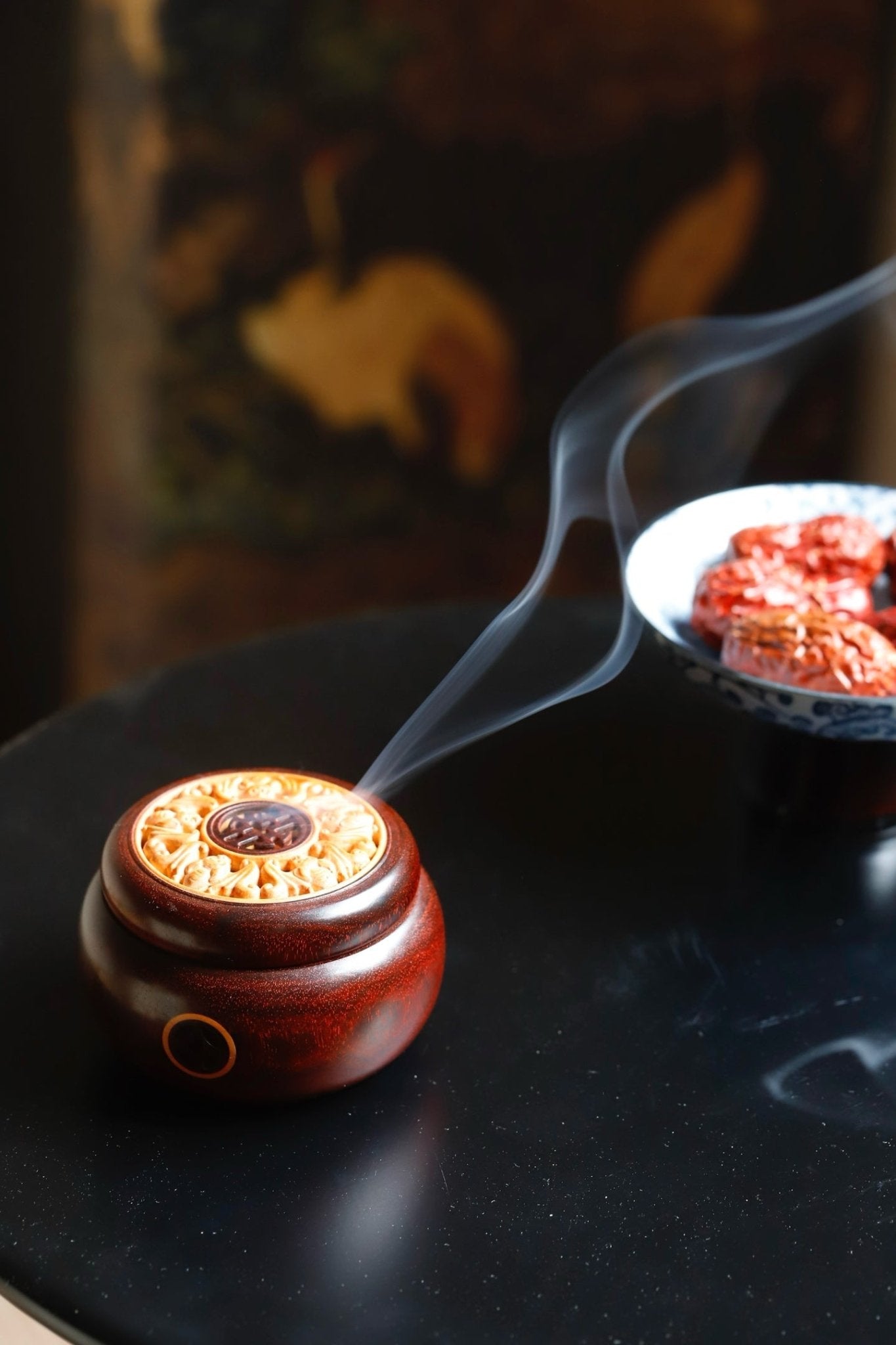 The lid of the box is hollowed out and carved with a bat, which symbolizes the arrival of five blessings. The whole device is exquisite and elegant, inlaid with boxwood, and the smoke smell is ethereal and smart. It can be elegantly placed in the space of literati.