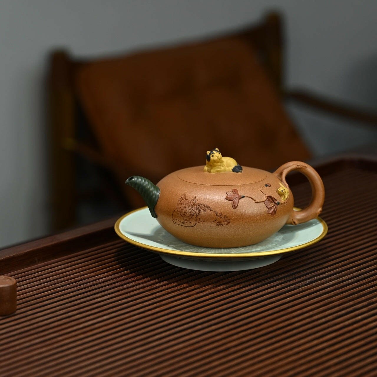 The pot is flat and round, like a melon or fruit, with a bulging belly. The cat is the button, and the spout is made of green leaves and branches. The roots lead to tender branches and petals, climbing up to the pot body. The kitten moves carefully along the tender branches under the watchful eyes of the mother cat, presenting a scene of mother-child affection, full of interest.