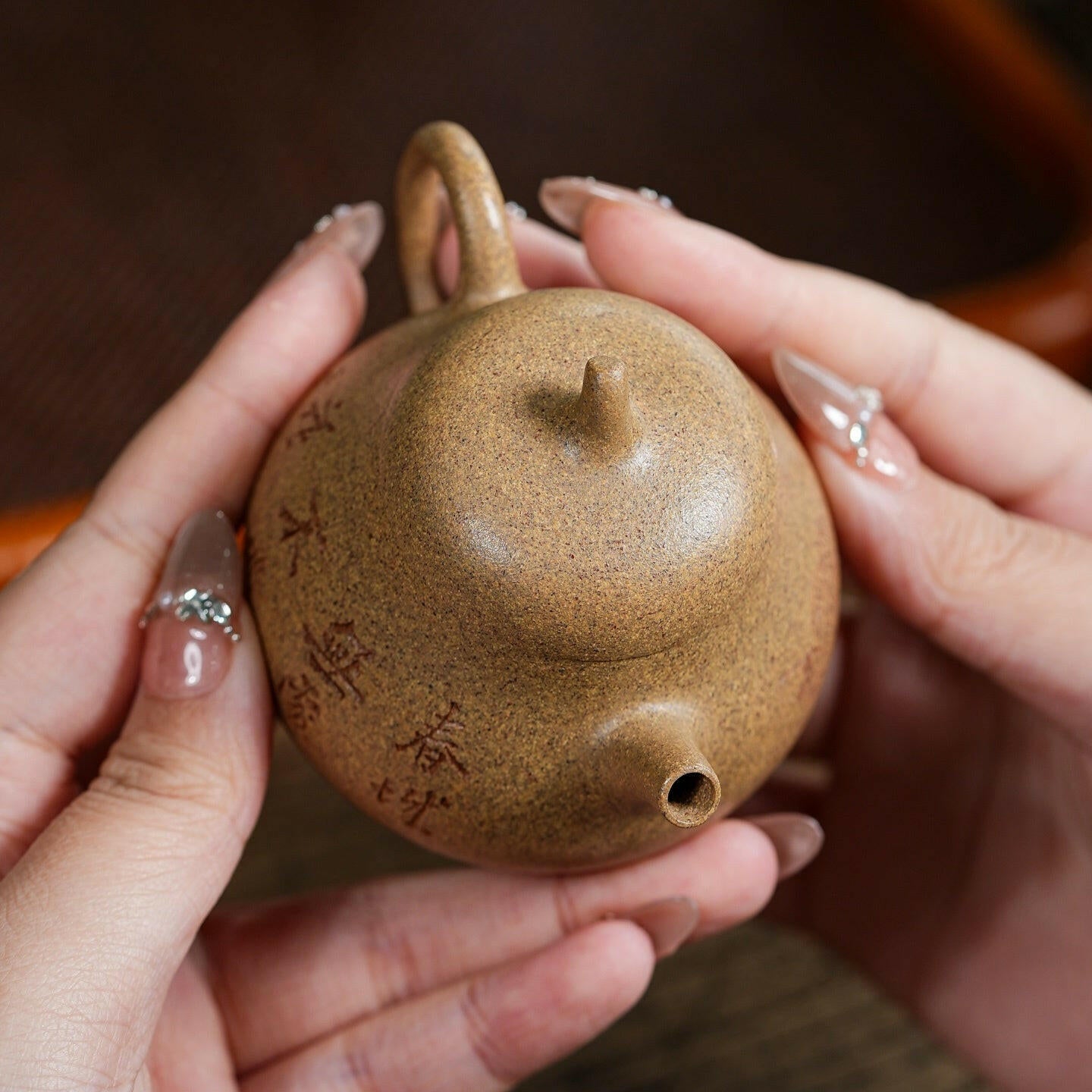 泥色溫潤如秋色,胎骨間透著歲月的拙樸。茄瓜壺型飽滿圓融,壺鈕如瓜蒂微翹,壺身線條似自然垂落的藤果,捧在掌心彷彿能觸到江南田園的煙火氣。