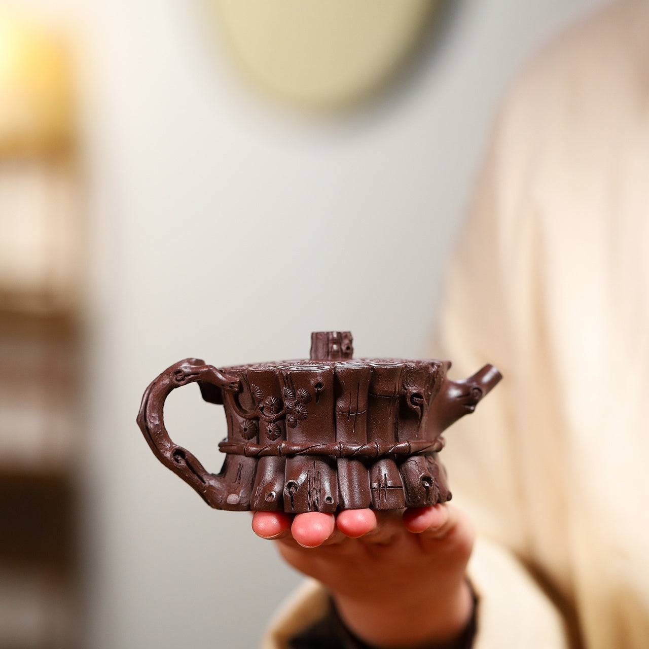 此壺採用一廠老紫泥精製而成。壺身仿似松、竹、梅三樹段束於一體,松段的松鱗、梅段的桿枝、竹段的竹節,都刻劃仔細,自然夾置,於繁復中見規整條理。