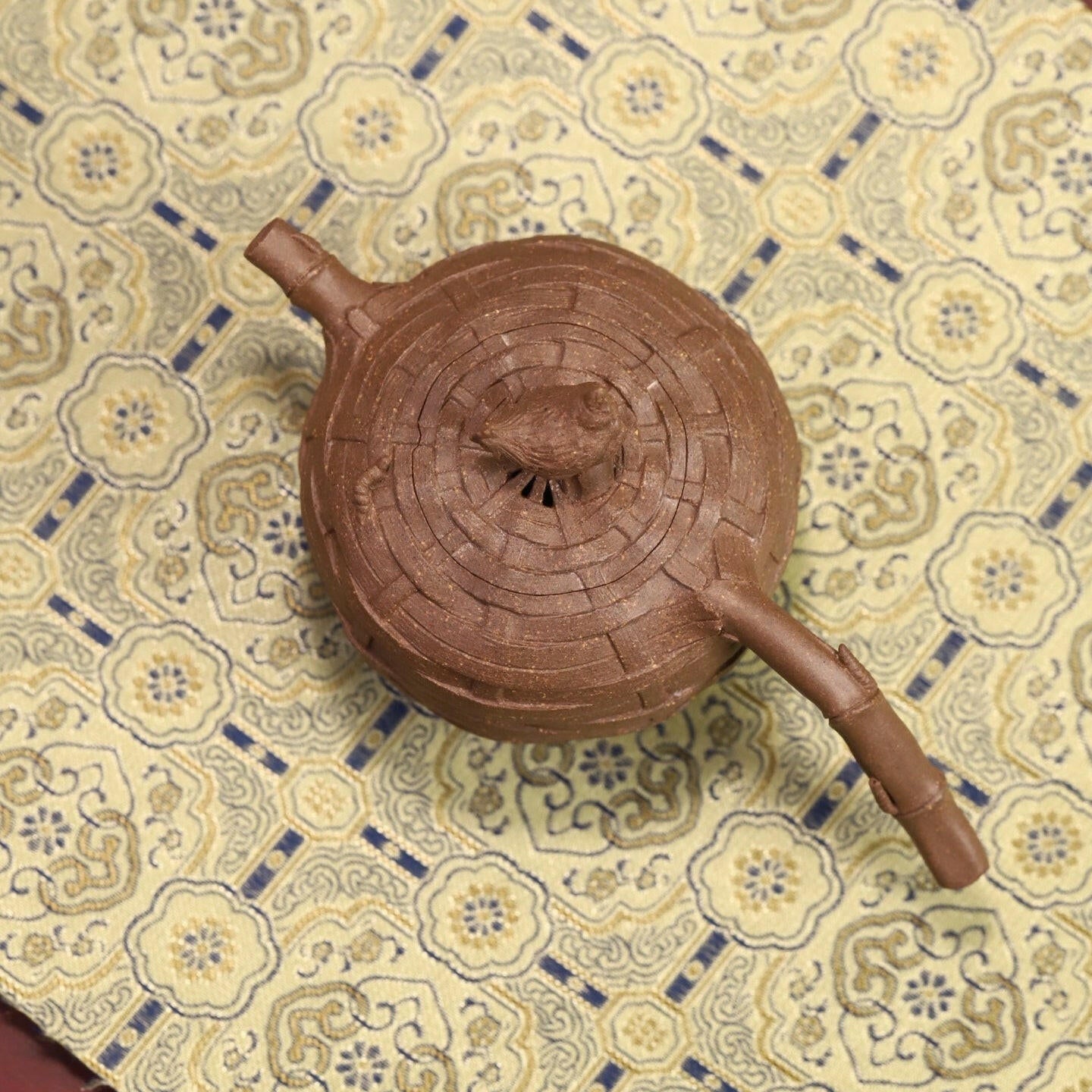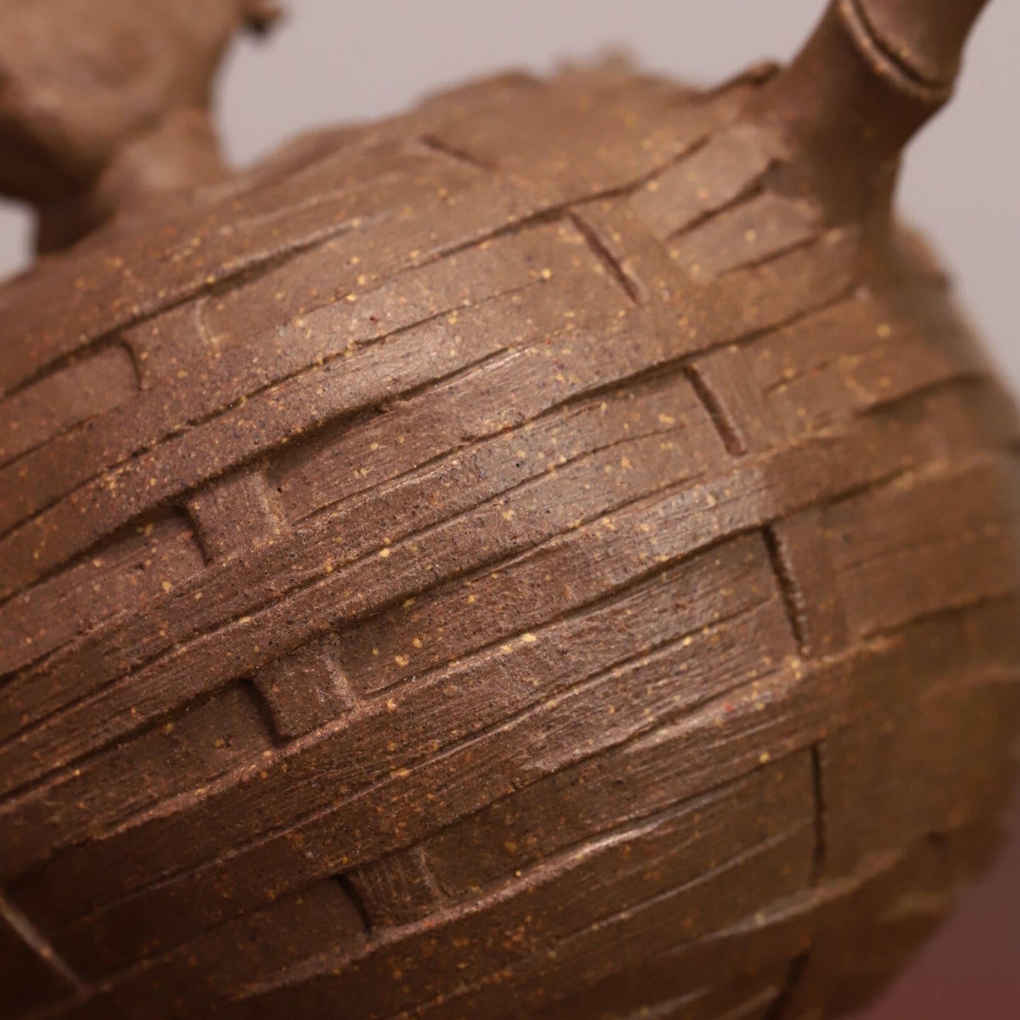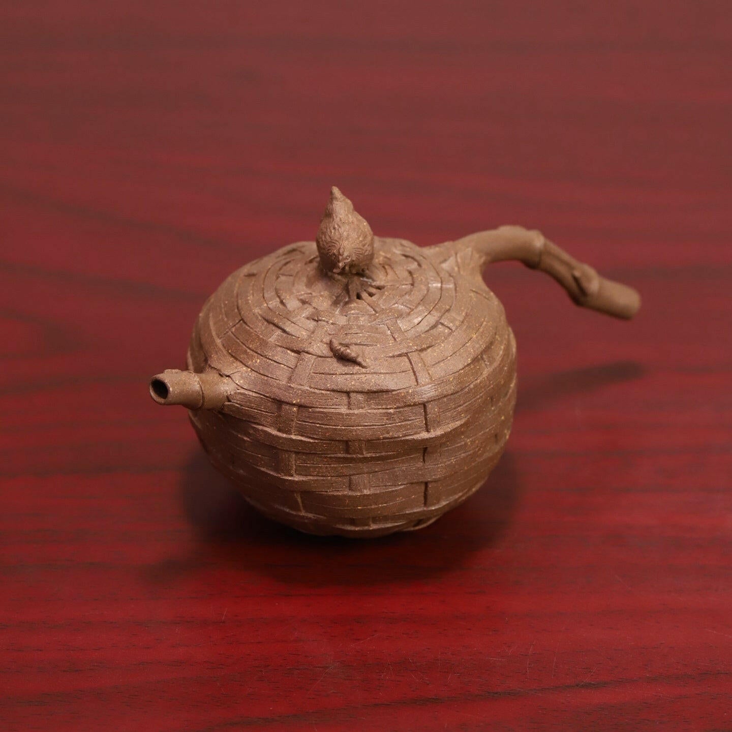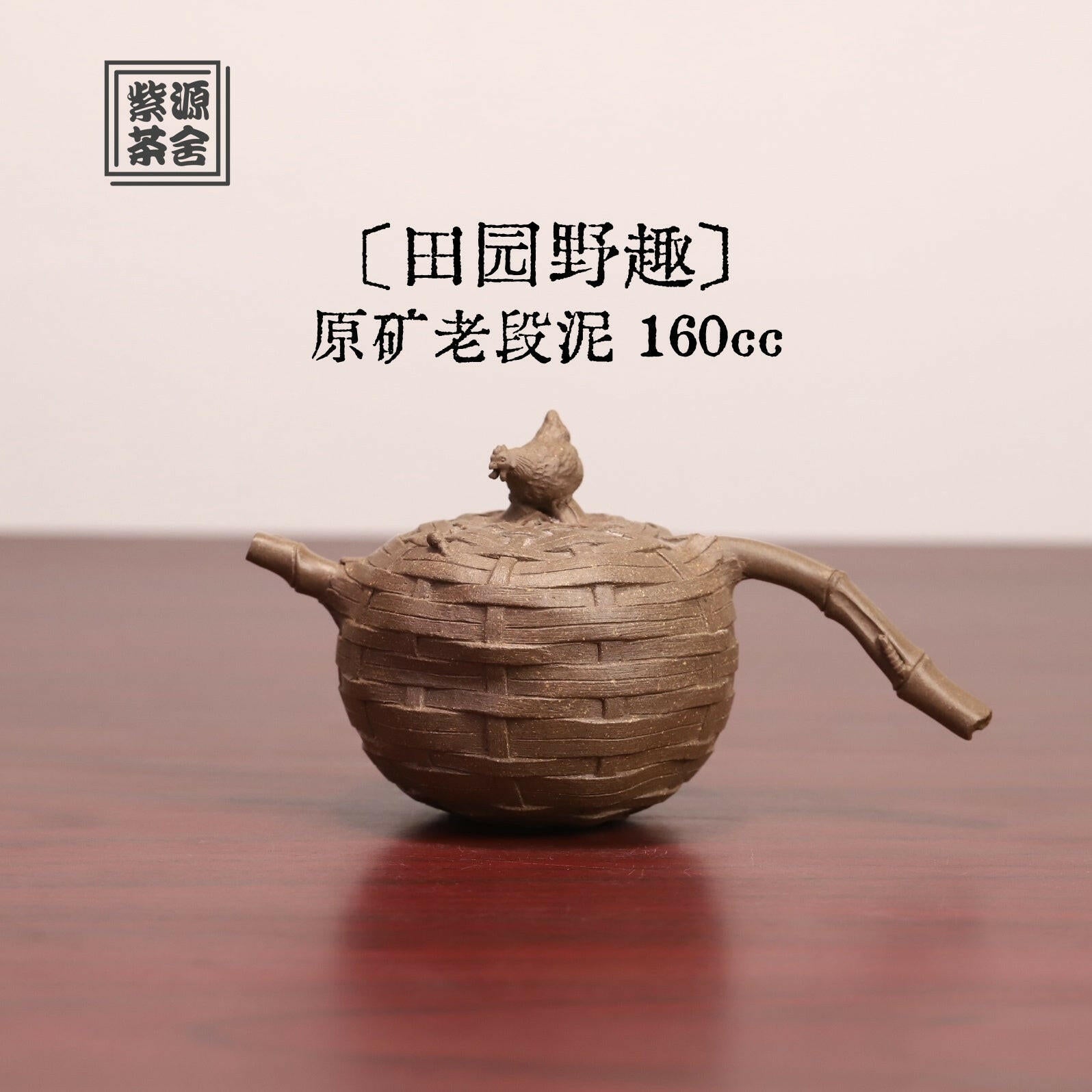 竹簍為座,母雞凝望草葉,俯身啄食-全手工紫砂壺以指尖塑生機,藤紋羽理皆流轉,茶湯溫潤生香,方寸間窺見田園野趣。